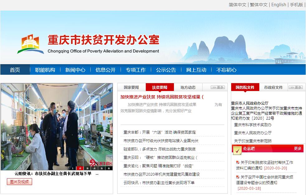 重庆市扶贫开发办公室是重庆市人民政府组成部门。其主要职责是:(一)贯彻执行扶贫开发法律、法规、规章和方针政策,负责全市扶贫开发工作的统筹协调、资金筹集、服务指导和监督管理工作。(二)拟定全市扶贫开发发展战略、政策措施、扶贫标准、发展规划、目标任务和年度计划,经批准后组织实施;参与拟定涉及贫困地区经济社会发展的政策和规划。(三)负责扶贫行政执法;负责分配和管理扶贫资金的物资;负责监督扶贫资金的使用管理,牵头组织扶贫资金使用的绩效考评;负责管理扶贫开发项目,指导扶贫开发项目的实施。(四)负责扶贫开发情况的统计和动态监测;负责全市扶贫系统统计信息工作;负责扶贫开发宣传工作。(五)组织贫困地区开展产业扶贫、科技扶贫、人力资源开发工作,指导片区扶贫开发,开展贫困地区干部有关扶贫政策和扶贫开发的培训工作。(六)组织、协调和指导社会扶贫工作,联系中央国家机关定点扶贫工作和东部发达地区对本市的扶贫协作工作,组织、协调本市以党政机关为主体的集团扶贫工作,组织民间力量扶贫工作;组织、协调和指导全市革命老区建设工作。(七)负责有关扶贫的国际交流与合作,负责外资和外援扶贫项目的引进和实施。(八)承办市政府交办的其他事项。
