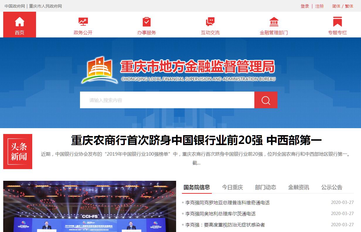 重庆市地方金融监督管理局(以下简称市金融监管局)是市政府直属机构,为正局级,挂重庆市金融工作局牌子。重庆市金融监管局的主要职责是:(一)依据国家法律法规,起草地方有关金融监管法规草案,负责牵头拟定地方金融监管的制度和办法。负责地方金融监管执法工作,依法查处违法违规行为。构建地方金融监管体系。(二)贯彻执行有关金融工作的法律、法规、规章和方针政策,承担国家金融政策的落地研究,提出我市金融工作建议并组织实施。(三)按照中央政策要求和有关法律法规规定,承接中央赋予地方的金融监管职责,负责全市地方金融监管工作;负责对小额贷款公司、融资担保公司、区域性股权市场、典当行、融资租赁公司、商业保理公司、地方资产管理公司、金融要素市场实施日常监管,对网络借贷信息中介机构、物流金融公司等新兴地方金融机构和活动实施监管;负责全市股权投资类企业的备案和服务。(四)承担牵头应对金融突发事件、开展全市打击非法金融活动的责任。配合中央在渝金融监管机构规范和维护地方金融秩序,防范和化解金融风险。(五)推进金融中心建设,拟订地方金融业发展规划并组织实施。承担中新(重庆)战略性互联互通示范项目金融服务委员会、自贸区金融工作推进组有关职责。(六)协调、引导金融机构为经济社会发展服务。负责拟上市公司的培育、推荐工作,发展多层次资本市场。推动发展普惠金融,改善和强化小微企业金融服务,推进农村金融改革和发展,强化农村金融服务。推动发展金融科技。(七)营造良好金融生态环境,负责在渝金融机构、金融中介机构的联络、协调和服务工作。指导区县(自治县)按中央和市委、市政府要求做好有关金融工作。负责职责范围内的金融人才队伍建设工作。(八)负责机关、直属单位和主管的社会组织党建工作。(九)完成市委、市政府交办的其他任务。