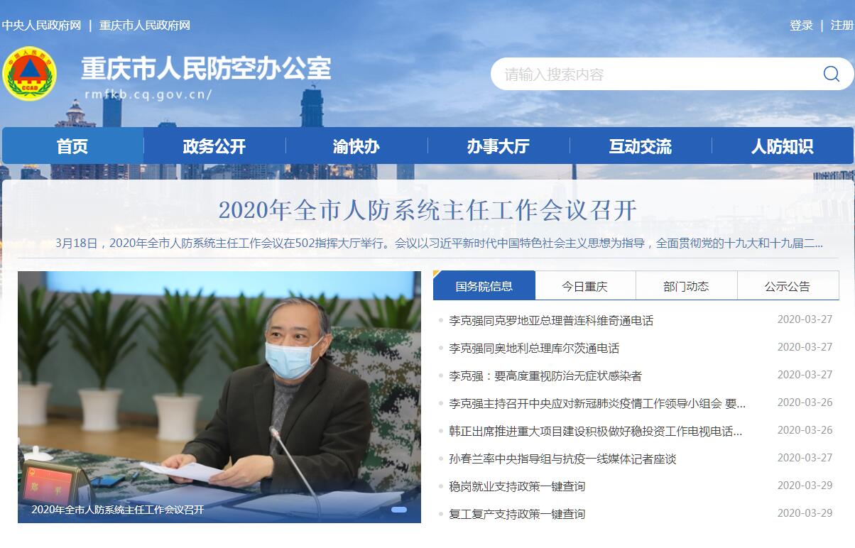 重庆市人民防空办公室主要职责:(一)贯彻执行国家关于人民防空工作的方针政策、法律法规规章、标准规范。起草人民防空地方性政策法规、政府规章草案、规范性文件及标准规范,并督导落实。(二)编制本市人民防空发展规划和专项规划,并做好组织实施和监督检查。组织拟订人民防空袭方案及实施计划,会同有关部门编制重要经济目标防护建设总体规划,参与编制地下空间建设和开发利用规划。(三)负责市级人民防空指挥场所、信息系统、疏散地域(基地)建设和管理。负责人民防空信息化建设,组织指导人民防空信息系统的建设和维护管理。组织开展人民防空警报建设、管理和防空警报试鸣及发放工作。(四)承担本市人民防空工程建设管理。依法监督管理人民防空工程及其设施设备建设质量和安全。依法监督检查人民防空工程的维护管理。依法承担人民防空工程建设、管理方面的行政许可工作。组织开展人民防空行政执法,具体执法交由相关执法队伍承担,并以部门的名义统一执法。(五)负责落实人民防空领域军民融合发展要求。指导检查城市地下空间开发建设兼顾人民防空要求。督导人民防空工程的开发利用、安全生产和平战转换。(六)会同有关部门指导开展重要经济目标防护工作。参与组织編制本市重要经济目标目录,指导检查重要经济目标单位制定防护方案和防护措施。按规定监督、指导相关单位落实重要经济目标防护工作。(七)组织开展人民防空训练演练。组织市本级指挥疏散、掩蔽、救援、消除空袭后果等实战化训练演练,参加军队组织的相关重大演训活动。组织人民防空军事斗争准备检验评估。检查指导人民防空专业队伍组建和训练,指导开展人民防空志愿者队伍建设。(八)组织开展本市人民防空宣传教育培训工作。负责人民防空宣传教育场所建设和维护管理。负责组织开展人民防空科研及学术交流。(九)管理人民防空经费和资产。负责人民防空建设资金的计划、管理和使用。负责人民防空国有资产的监督管理。(十)承担国防动员委员会人民防空办公室的工作;承办市政府交办的其他事项。 战时职责按国务院、中央军委的有关规定执行。