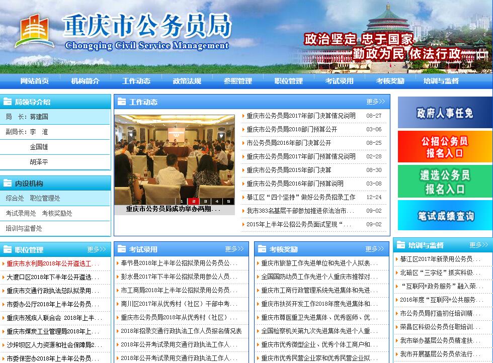 重庆市公务员局是重庆市的政府机关,下设综合处、职位管理处、考试录用处、考核奖励处、培训与监督处五个处室,有完善公务员考核制度,拟订公务员培训规划等职责。其主要职责: 一、贯彻执行公务员分类、 录用、 考核、 职务任免与升降、奖惩、 培训、 交流与回避、 辞职辞退、 申诉控告、 职位聘任等方面的法律、 法规、 规章和方针政策,起草公务员管理的地方性法规、 规章, 拟订事业单位工作人员参照公务员法管理和聘任制公务员管理的实施细则。二、拟订公务员行为规范、 职业道德建设和能力建设政策,拟订公务员职位分类标准、 管理办法的实施细则, 依法对公务员 实施监督, 负责公务员信息统计管理工作。三、完善公务员考试录用制度, 负责组织本市机关公务员、参照公务员法管理单位工作人员的考试录用工作。四、完善公务员考核制度, 拟订公务员培训规划、 计划和标准, 负责组织市级机关公务员培训工作。五、完善公务员申诉控告制度和聘任制公务员人事争议仲裁制度, 保障公务员合法权益。六、会同有关部门拟订奖励制度草案, 拟订公务员奖惩政策并指导实施, 审核上报国家奖励表彰的单位和人员, 审核以市委、 市政府名义奖励表彰的项目 和个人、集体人选。七、完善公务员交流制度, 拟订公务员调任、 转任、 挂职锻炼政策并指导和组织实施。八、承办法定人事任免事项和以市政府名义任免的人员任免手续。九、承办市政府及市人力资源和社会保障局交办的其他事项。