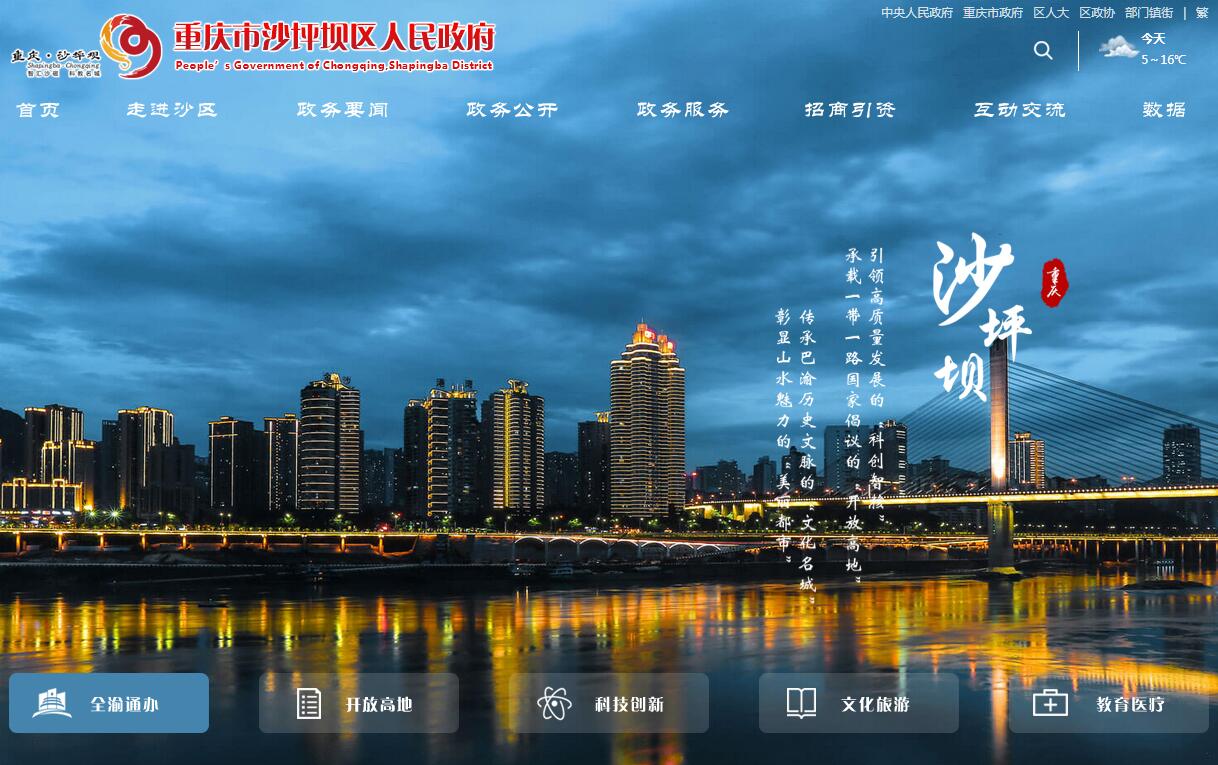 | 网站简介: 沙坪坝区,隶属重庆市,是重庆主城区,重庆大都市区。位于重庆市西南部,东滨嘉陵江与江北区、渝北区相邻,东南与渝中区接壤,东北与北碚区相连,南与九龙坡区相靠,西抵缙云山接璧山区,紧邻重庆市高新技术产业开发区和北部新区。沙坪坝区自周朝巴国属地起,已有3000余年的历史,融巴渝文化、沙磁文化、抗战文化、红岩文化于一炉,是红岩精神的重要发祥地;是重庆市科教文化区,重庆大学城位于沙坪坝区西部。截至2016年,沙坪坝区辖19个街道、7个镇;总面积396.2平方公里。2017年末,户籍人口为83.2万人;2017年,沙坪坝区实现地区生产总值(GDP)860.2亿元。沙坪坝区先后获”全国双拥模范城“、”全国文物工作先进县“、”市抗洪救灾工作先进集体“、“首批全国文化旅游胜地”等荣誉称号。 |