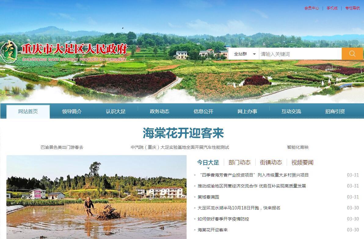 大足区位于重庆西部,地处成渝经济区腹心,既融入重庆都市经济圈、又主动对接成都,是成渝城市群重要节点。2011年经国务院批准,撤销原双桥区、大足县,设立大足区。全区幅员面积1436平方公里,辖27个镇街,总人口106万。大足是驰名中外的石刻之乡、五金之乡和中国重型军用汽车的“摇篮”。先后荣获国家级生态示范区、国家园林城市、全国绿化模范城市等名片。2018年,全区地区生产总值517.6亿元,同比增长7.3%;一般公共预算收入30.8亿元,其中税收收入17.8亿元,增长2.4%。大足是历史悠久的文化名城。大足始建于唐朝乾元元年(公元758年),晚唐至两宋近400年间,大足一直是昌州府治所在地。宋人沈立在《海棠记》中写道:“天下海棠无香,惟大足治中海棠独香”,故大足又称“海棠香国”。革命时期,唐赤英、饶国梁、饶国模等一批革命先辈为中国人民解放事业做出了突出贡献。当前,全区正深入挖掘石刻文化、五金文化、海棠香国文化、重汽文化、革命文化等本土优秀传统文化精髓,着力打造一座文化符号无处不在、充满古朴气息的人文之城。大足是重庆唯一的世界文化遗产地。大足石刻雕像五万余尊,集中国石刻艺术精华之大成,实现了佛教、儒教、道教文化的历史性融合。1999年12月,以宝顶山、北山、南山、石门山、石篆山“五山”为代表的大足石刻,被联合国教科文组织列入《世界遗产名录》。2015年6月,全国石质文物保护“一号工程”—千手观音造像抢救性保护工程历时7年顺利竣工,千手观音金光再现。全区将充分发挥文化资源优势,把保护好、研究好、利用好大足石刻作为谋划推进发展的首要战略。大足是成渝城市群的国际文旅城。围绕打好“温泉”牌、“乡村”牌、“人文”牌,着力提升旅游的文化底蕴和特色魅力。龙水湖国际旅游度假区着力打造养心养生养老福地,龙水湖温泉获评国家五星级温泉;点燃“最美乡愁”,培育打造“棠香人家”“老家•观音岩”等特色乡村文化旅游品牌。2018年,大足精彩绽放央视《魅力中国城》,荣获“优秀魅力城市”“魅力文化景区”“魅力乡村旅游目的地”三大奖项。当前,我们深挖文化内涵,着力推进大足石刻文创园建设,让优秀历史文化活在当下、服务当代。大足是正在崛起的新兴产业城。初步形成以双桥经开区、大足高新区为主战场的产业布局。经开区重点发展汽车配套、电子信息产业,专用车(改装车)年产能达2万辆,笔电机壳产能达4500万套。高新区重点发展智能装备、五金家居产业, 2万台电梯产业集群、120万辆摩托车产业集群加速形成,五金市场交易额达到380亿元。大足是“大丰大足”的乡村振兴之地。建成袁隆平院士专家工作站,利用富硒、富锶土壤资源,研发品类丰富的农产品。坚持“一园四基地”发展思路,加快美丽乡村建设,打造30万亩优质水稻基地、22万亩优质油菜基地、45万亩果蔬基地、1200亩芳香种植观光区,建设全国雷竹种苗创新繁育基地、西南雷竹种植培训示范基地。积极发展道口经济,发展现代农业、乡村旅游、农产品精深加工、冷链物流配套等产业,培育新产业新业态。坚决打好精准脱贫攻坚战,打造“花椒村”“李子村”“草莓村”“樱桃村”,帮助贫困群众实现稳定脱贫。大足是改革创新的活力之城。国家农村土地征收和农村集体经营性建设用地入市改革试点取得明显成效,率先在全国建立城乡统一的地价体系。完成全国承担行政职能事业单位改革试点工作。深化“放管服”改革,在全市率先实行“三十三证合一”。首创“党员干部亲属涉权事项公开制度”,获全市推广。“强化企业服务促进民间投资健康发展”“落实重大政策措施”“农村危房改造”等一批典型经验做法受到国务院办公厅通报表扬。改革工作被中央媒体宣传报道29次。大足是充满民生温度的幸福之城。确定每年12月25日集中投用一批重大民生项目。2018年,已集中投用8个领域21个子项目,总投资35.4亿元。引进5所高校,成功创建全国义务教育发展基本均衡区,成功创建三甲医院,“三馆一中心”全面建成开放。大力提升城市品质,坚持每年至少新建3个公园,新增25万平方米城市绿地。城区空气质量优良天数达到315天,城区噪声区域达标100%,次级河流水质总体达到Ⅲ类,森林覆盖率45.6%。当前,大足全面贯彻习近平新时代中国特色社会主义思想和党的十九大精神,紧紧围绕习近平总书记对重庆提出的“两点”定位、“两地”“两高”目标、发挥“三个作用”和营造良好政治生态的重要指示要求,坚决打好“三大攻坚战”,全面落实“八项行动计划”,结合大足实际,大力实施“七个提升行动”,努力推动高质量发展、创造高品质生活,不断增强人民群众的获得感、幸福感、安全感。