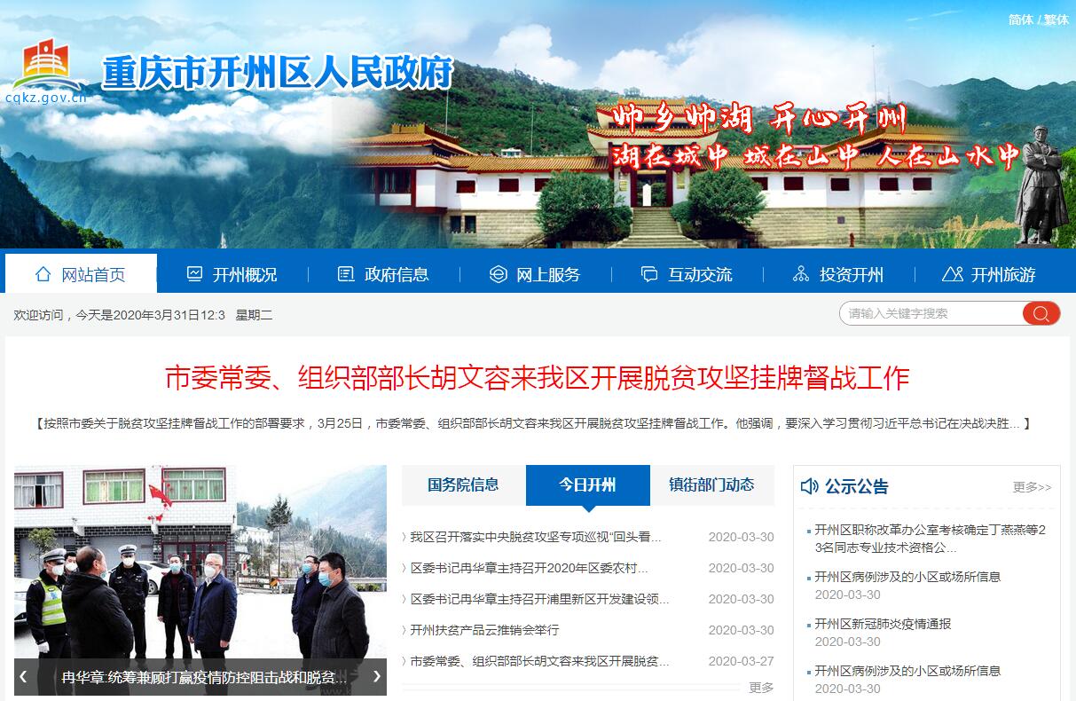 | 网站简介: 开州区隶属于重庆市,位于重庆市东北部,三峡库区小江支流回水末端,介于北纬30°49′30″-31°41′30″、东经107°55′48″-108°54′之间,西邻四川省开江县,北依大巴山接城口县和四川省宣汉县,东毗云阳县和巫溪县,南近长江邻万州区。2018年末,开州区幅员面积3959平方公里,户籍人口168.53万。辖28个镇、7个街道、5个乡。2018年,全年实现地区生产总值473.13亿元,比2017年增长7.6%。2011年,被重庆市政府列入“民生工业试点园区”,被表彰为“渝东北优秀园区”。获得过“2013中国休闲小城”、“全国粮食生产先进单位”等荣誉称号。三次获得“全国双拥模范城(县)”称号(2000年、2003年、2011年),2016年是开州第四次获此殊荣。 |