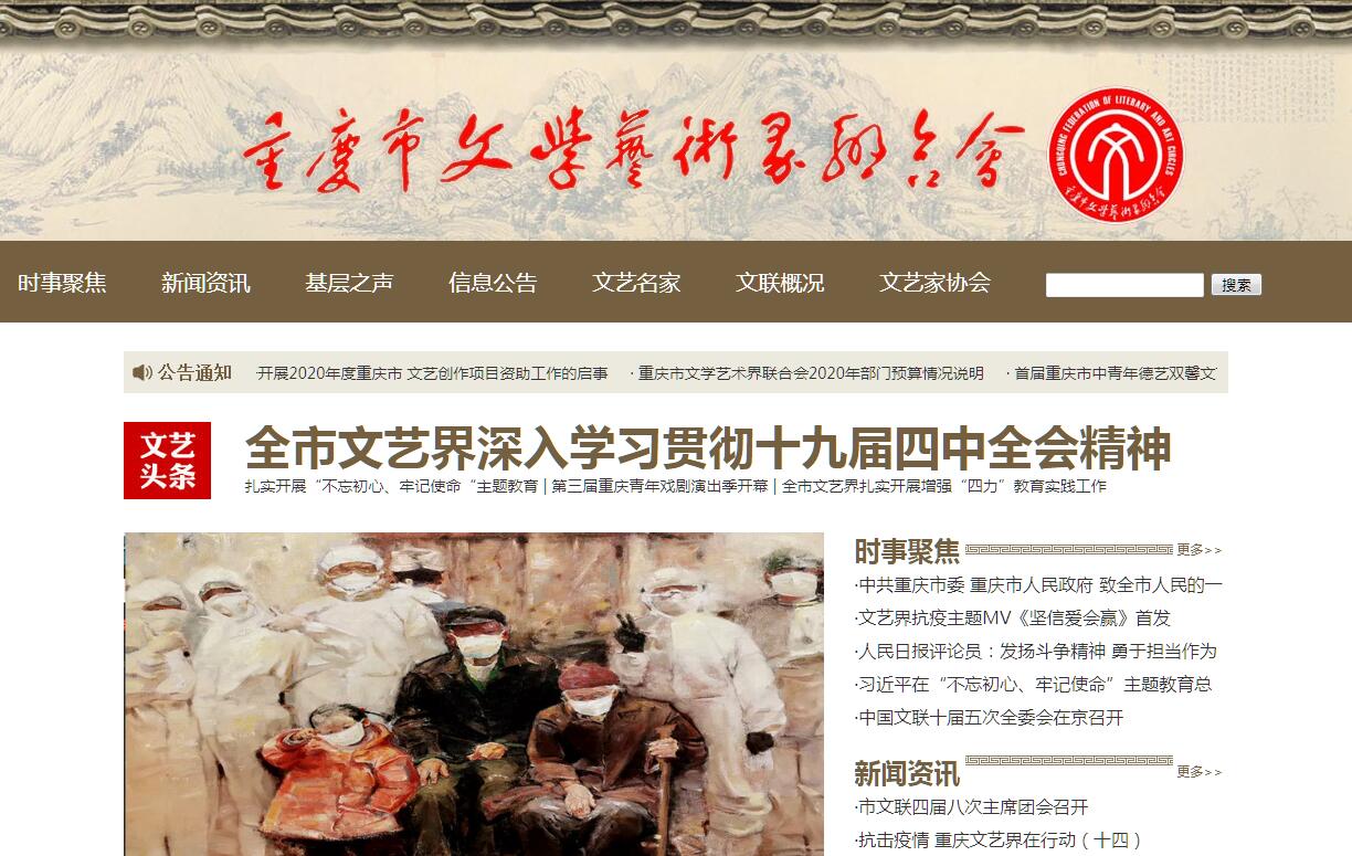 重庆市文学艺术界联合会(简称重庆市文联)于1951年5月4日成立,“文革”期间被撤销,1979年“拨乱反正”后重新恢复工作,1997年3月成为中国文联团体会员。直辖后的市第一次文代会召开于1999年12月,之后分别于2005年4月、2011年6月和2016年10月召开了第二、第三和第四次市文代会。重庆市文联是中共重庆市委、重庆市人民政府领导的,由全市性文艺家协会、区县(自治县)文联、行业企业文联和其它文艺社团组成的正厅局级人民团体机关,是市委、市政府联系全市文艺界的桥梁和纽带,是繁荣社会主义文艺、发展先进文化的重要力量。现有团体会员单位58个,其中市级文艺家协会13个,区县文联39个,行业、企业文联6个。有全国个人会员2135名,市级个人会员14927名。重庆市文联现有党组成员3人,即党组书记、副主席陈若愚,党组成员、副主席龙川、杨矿。主席由中国戏剧家协会副主席、重庆市川剧院院长沈铁梅兼任,毕富纯、刘光全、刘能风、辛华、张礼慧、陈涛、周晓风、庞茂琨、黄翔、程联群、鲁广峰、漆钢为兼职副主席。周和平为秘书长,张宁、王琳、程汪红、周滢劼、胡启华、胡剑川为副秘书长。 重庆市文联内设5个职能部门,即办公室、组织人事部、组织联络部、文艺工作部、理论研究室(文艺网络宣传中心),并按有关规定设立机关党委,下辖1个事业单位即文艺家活动中心。现有编制数65名,其中行政编制21名,机关后勤编制3名,参公事业编制36名,自收自支事业编制5名。重庆市文联活动及办公主场地为市文艺家活动中心大楼,系纯公益性文化设施。大楼及附属艺术广场共计16905㎡,其中主体建筑10040㎡,集美术馆、艺术剧场、艺术工作室、艺术家活动室、影视视听室、摄影棚、录音棚、排练厅和市文联、各市级文艺家协会办公于一体。重庆市文联承担了每两年一届的重庆艺术奖的评选工作;开通了文联网站www.cqwl.org和重庆文艺微信公众号;创办了文艺刊物《重庆文艺》(内部)和文艺评论刊物《重庆评论》(公开出版)。