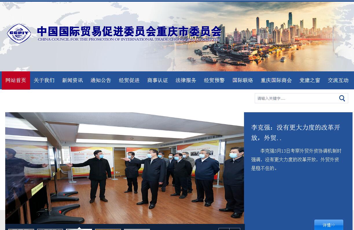 中国国际贸易促进委员会重庆市委员会成立于1983年,是由重庆市经济贸易界有代表性的人士、企业、协会和团体组成的民间对外经济贸易组织。其主要职能如下:一、开展同世界各国、各地区经济贸易界、商协会和其他经贸团体以及有关国际组织的联络工作;邀请和接待外国经济贸易界人士和代表团组来访,考察、洽谈合资合作项目;组织重庆经济贸易、技术代表团、企业家代表团出国访问、考察、洽谈合资合作项目,参加有关国际组织的活动;负责与外国对口组织在华设立的代表机构以及外国在华成立的商会进行联络;组织、参加或与外国相应机构联合召开有关经济贸易技术合作和法律方面的会议;组织重庆管理人员和技术人员出国进行管理和技术培训;开展重庆市劳务输出。二、代表重庆市参加国际展览会的活动;赴国外主办重庆经济贸易展览会和参加国际博览会;组织我市参加国外技术交流会。三、安排和举办国外来渝的经济贸易或技术展览会、技术交流会和样本陈列会;主办国际专业性或综合性展览会。四、主办或协助我市区县(自治县、市)举办招商引资洽谈会;拓展、管理对外开放中的民间招商引资等工作。五、代理、办理国际经济贸易和海事的仲裁、调解事务;出具中国出口商品原产地证明书;出具人力不可抗拒证明;签发和认证对外贸易和海上货运业务的文件和单证;代办领事认证;出具和代办涉外经贸文件证明书;为到国外从事临时出口活动的公司、企业或个人代办出具有关单证册,并对其提供担保。六、代理中国企业在国外或外国公司和个人在中国办理商标注册和专利申请;办理有关工业产权和知识产权的咨询、争议及技术贸易等业务。七、开展国内外经济调查研究和经济信息的搜集、整理、传递和发布工作;向国内外有关企业和机构提供经济技术合作和贸易方面的信息和咨询服务及国内外公司、企业的资信调查服务;负责协助国际贸易欠款的追收服务。联系、组织中外经济贸易界的技术交流活动;承办中外经济技术合作项目的评估和可行性研究以及法律咨询、法律顾问工作。八、指导、协调本市各地贸促支会和国际商会的工作;负责对各分支机构及会员的服务和培训工作。九、办理市委、市政府和中国贸促总会(中国国际商会)交办的其他有关事项。