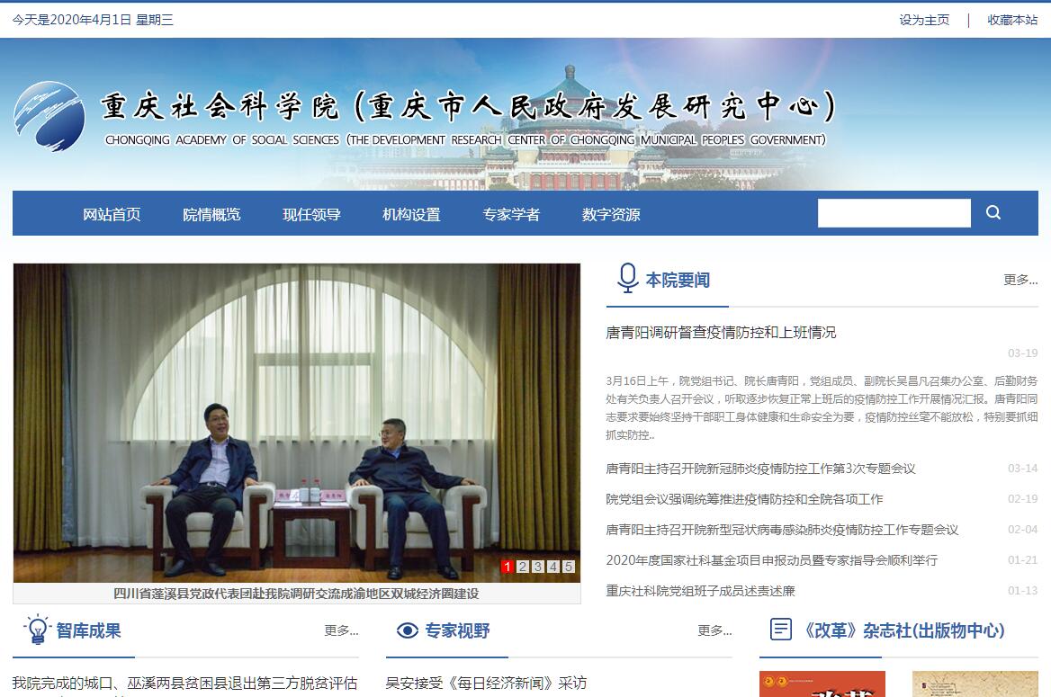 重庆社会科学院是重庆市目前唯一的综合性人文、社会科学研究机构、政府决策咨询机构,是市委、市政府的思想库和智囊团。其前身是1982年成立的重庆市社会科学研究所,1987年3月建院。1988年成立重庆市人民政府发展研究中心,与重庆社会科学院实行“一套班子、两块牌子”的管理体制。现有在职人员126名,离退休人员53名。在职人员中,专业技术人员78名,其中具有正高职称的人员28名,副高职称的人员22名,博士22名。下设哲学与政治学、文史、法学、社会学、产业经济与企业发展、城市建设与管理、城乡统筹发展、财政金融、商贸与物流、区域经济与三峡库区发展等10个研究所,办公室(财务处)、科研组织处、“中心”秘书处(综合处)、人事处、后勤处、机关党委等6个行政部门,以及改革杂志社、对外学术交流中心、培训中心、图书馆、新闻中心和出版物中心。另有装备制造业发展、应用心理学、决策咨询、公共财政、开发性金融、科技创新、宗教与社会、内陆型城市开放发展、和谐重庆、民营经济、房地产、现代文化产业发展、工商行政管理、投资管理服务、区域经济、国民经济运行与可持续发展、新闻出版、新闻传播、区域低碳经济与可持续发展等研究中心,渝中、涪陵2个分院。两江新区研究院、重庆市中国特色社会主义理论体系研究中心在我院挂牌,秘书处设在我院。重庆市社会科学研究系列高级专业技术职务评审委员会也设在我院。
