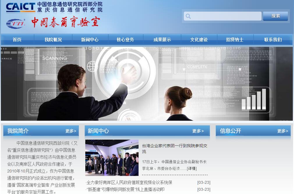 中国信息通信研究院西部分院(又名"重庆信息通信研究院")由中国信息通信研究院与重庆市经济与信息化委员会以及南岸区人民政府合作建设,于2010年10月正式成立,作为中国信息通信研究院的内设派出机构进行管理,遵循“国家高端专业智库 产业创新发展平台”的服务宗旨开展工作,是我国中西部地区最重要的公共技术服务平台之一。中国信通院西部分院致力于提升我国中西部地区工业与信息化进程,优化产业发展环境,强化产业区域优势,培养和扶持中西部地区电子信息相关企业拓展国内外市场能力,不断完善自身科研与检测能力,努力打造中西部地区电子信息产业、物联网产业科研检测基地,鼎力支撑重庆市成为中国新一代移动通信产业基地和中国物联网产业核心基地。重庆电子信息中小企业公共服务有限公司(以下简称:“平台公司”)成立于2012年9月,由重庆市经济和信息化委员会、南岸区人民政府、重庆市经济技术开发区管委会和中国信息通信研究院共同组建。平台公司由中国信息通信研究院西部分院具体执行日常管理工作,以立足重庆、服务全国的电子信息企业为宗旨,在电子信息、互联网+领域重点布局,倾力培养技术团队、重视服务能力建设,为重庆市企业提供研发设计、技术咨询、认证代理、解决方案、培训等服务。现主营产品包括家居智能化系统、社区智慧化平台、资产管理信息化系统等,现已有稳定合作单位10余家,打造信息化案例30余个。同时,公司通过支撑南岸区产业协同创新联盟的相关工作,为南岸区企业和政府、企事业单位的技术合作搭建重要沟通平台和桥梁,支撑产学研项目对接、项目合作,以产业发展为导向,开展政府、行业培训,为南岸区孵化创新创业企业、培养行业龙头企业提供了可靠支撑,对重庆市电子信息产业发展起到了重要的推进作用。
