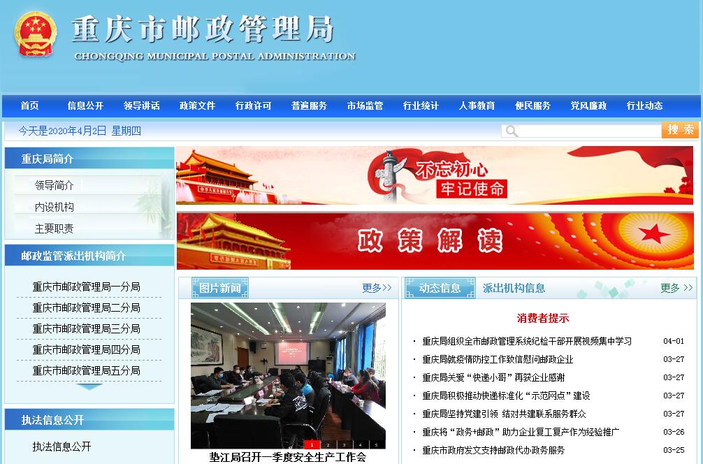| 网站简介: 重庆市邮政管理局主要职责:(一)贯彻执行国家关于邮政业管理的法律法规、方针政策及邮政服务标准;(二)监督管理重庆市邮政市场;(三)组织协调重庆市邮政普遍服务以及机要通信、义务兵通信、党报党刊发行、盲人读物寄递等特殊服务的实施;(四)办理国家邮政局交办的其他事项。 |