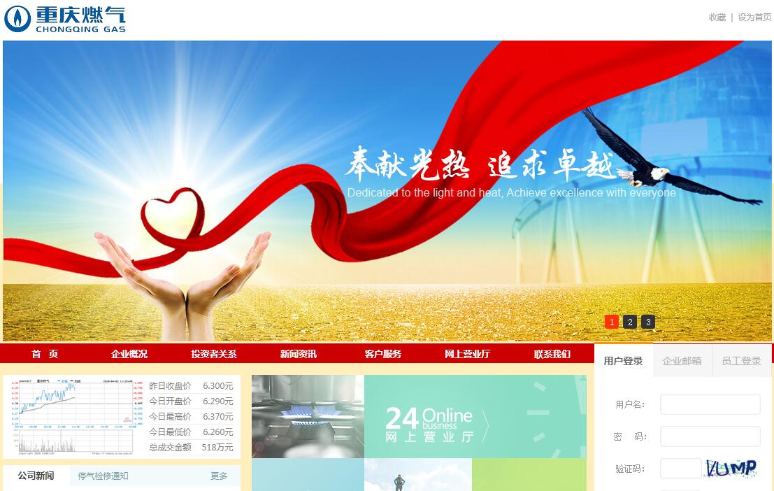 | 网站简介: 重庆燃气集团股份有限公司是重庆市能源投资集团有限公司控股,华润燃气(中国)投资有限公司、重庆渝康资产经营管理有限公司参股的国有控股上市企业,股票代码:600917。公司多年来致力于精耕燃气供应、输、储、配、销售及管网的设计、制造、安装、维修、销售、管理、技术咨询;区域供热、供冷、热电联产的供应;燃气高新技术开发,管材防腐加工,燃气具销售等经营业务。截止2017年末,公司天然气供应范围已覆盖重庆市25个区县,资产总额82.43亿元,服务客户470万户。公司作为关系国计民生的管理服务型企业,立足城市燃气供应行业基础性、服务性、公共安全性三大特征,以“奉献光热、追求卓越”为企业核心理念,秉承“诚信、优质、安全、创新”的企业精神,依法合规的运营,通过充足的气源、安全合理的燃气输配管网、充分的储气调峰设施和高度自动化的调度手段、完善的抢险应急救援机制及全方位、人性化的优质服务打造重庆市天然气安全供应保障体系,为中国最年轻的直辖市——重庆构建起保障清洁能源供应的“蓝色命脉”。 |