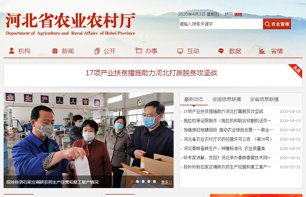 河北省农业农村厅为省政府组成部门,机构规格正厅级。中共河北省委农村工作领导小组办公室设在省农业农村厅。河北省农业农村厅贯彻落实党中央和省委关于“三农”工作的方针政策和决策部署,坚持和加强党对“三农”工作的集中统一领导。其主要职责是:(一)统筹研究和组织实施全省“三农”工作的发展战略、中长期规划、重大政策。组织起草农业农村有关地方性法规、政府规章草案,指导全省农业综合执法。参与涉农的财税、价格、收储、金融保险、进出口等政策制定。(二)协调推动发展全省农村社会事业、农村公共服务、农村文化、农村基础设施和乡村治理。牵头组织改善农村人居环境。协调推进乡村文明和优秀农耕文化建设。指导农业行业安全生产工作。(三)拟订省级深化农村经济体制改革和巩固完善农村基本经营制度的政策。负责农民承包地、农村宅基地改革和管理有关工作。负责农村集体产权制度改革,指导农村集体经济组织发展和集体资产管理工作。指导农民合作经济组织、农业社会化服务体系、新型农业经营主体建设与发展。(四)指导全省乡村产业、农产品加工业和休闲农业发展工作。提出促进大宗农产品流通的建议,培育、保护农业品牌。发布农业农村经济信息,监测分析农业农村经济运行。承担农业统计和农业农村信息化有关工作。(五)负责全省种植业、畜牧业、渔业、农垦、农业机械化等农业各产业的监督管理。指导粮、棉、油、菜、水果、肉、蛋、奶、蜜、渔等农产品生产。组织构建现代农业产业体系、生产体系、经营体系,指导农业标准化生产。负责远洋渔业管理和渔政渔港监督管理。(六)负责全省农产品质量安全监督管理。组织开展农产品质量安全监测、追溯、风险评估和监督抽查。参与制定农产品质量安全地方标准并会同有关部门组织实施。指导农业检验检测体系建设。(七)负责全省农业资源保护、开发与利用。指导农用地、渔业水域以及农业生物物种资源的保护与管理,负责水生野生动植物保护、耕地及永久基本农田质量保护工作。指导农产品产地环境管理和农业清洁生产。指导设施农业、生态循环农业、节水农业发展以及农村可再生能源综合开发利用、农业生物质产业发展。牵头管理外来物种。(八)负责有关农业生产资料和农业投入品的监督管理。组织农业生产资料市场体系建设,拟订有关农业生产资料省级标准并监督实施。制定兽药残留限量和残留检测方法省级标准并按规定发布。组织兽医医政、兽药药政药检工作,负责执业兽医和畜禽屠宰行业管理。(九)负责农业防灾减灾、农作物重大病虫害预测预报及防治工作。指导动植物防疫检疫体系建设,组织、监督省内动植物防疫检疫工作,依法发布疫情并组织扑灭。(十)负责农业投资管理。提出农业投融资体制机制改革建议。编制省级投资安排的农业投资项目建设规划,提出农业投资规模和方向、扶持农业农村发展财政项目的建议,按规定权限审批农业投资项目,负责农业投资项目资金安排和监督管理。(十一)推动农业科技体制改革和农业科技创新体系建设。指导农业产业技术体系和农技推广体系建设,组织开展农业领域的高新技术和应用技术研究、科技成果转化和技术推广。负责农业转基因生物安全监督管理和农业植物新品种保护。(十二)指导农业农村人才工作。拟订农业农村人才队伍建设规划并组织实施,指导农业教育和农业职业技能开发,指导新型职业农民培育、农业科技人才培养和农村实用人才培训工作。(十三)牵头开展农业对外合作工作。承办政府间农业涉外事务,组织开展对外农业贸易和有关国际交流合作,具体执行有关农业援外项目。(十四)完成省委、省政府交办的其他任务。
