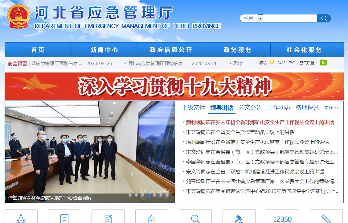 河北省应急管理厅贯彻落实党中央和省委关于应急管理工作的方针政策和决策部署,坚持和加强党对应急管理工作的集中统一领导。其主要职责是:(一)负责应急管理工作,指导各级各部门应对安全生产类、自然灾害类等突发事件和综合防灾减灾救灾工作。负责安全生产综合监督管理和工矿商贸行业安全生产监督管理工作。(二)拟订应急管理、安全生产等政策规定,组织编制省应急体系建设、安全生产和综合防灾减灾规划,起草地方性法规和政府规章草案,组织制定相关规程和标准并监督实施。(三)指导应急预案体系建设,建立完善事故灾难和自然灾害分级应对制度,组织编制省总体应急预案和安全生产类、自然灾害类专项预案,综合协调应急预案衔接工作,组织开展预案演练,推动应急避难设施建设。(四)牵头建立统一的全省应急管理信息系统,负责信息传输渠道的规划和布局,建立监测预警和灾情报告制度,健全自然灾害信息资源获取和共享机制,依法统一发布灾情。(五)组织指导协调安全生产类、自然灾害类等突发事件应急救援,承担省应对重大灾害指挥部工作,综合研判突发事件发展态势并提出应对建议,协助省委、省政府指定的负责同志组织重大灾害应急处置工作。(六)统一协调指挥各类应急专业队伍,建立应急协调联动机制,推进指挥平台对接,衔接解放军和武警部队参与应急救援工作。(七)统筹应急救援力量建设,负责消防、森林和草原火灾扑救、抗洪抢险、地震和地质灾害救援、生产安全事故救援等专业应急救援力量建设,管理省综合性应急救援队伍,指导各级及社会应急救援力量建设。(八)组织协调消防工作,指导各级消防监督、火灾预防、火灾扑救等工作。(九)指导协调森林和草原火灾、水旱灾害、地震和地质灾害等防治工作,负责自然灾害综合监测预警工作,指导开展自然灾害综合风险评估工作。(十)组织协调灾害救助工作,组织指导灾情核查、损失评估、救灾捐赠工作,管理、分配省救灾款物并监督使用。(十一)依法行使省安全生产综合监督管理职权,指导协调、监督检查省有关部门和各市(含定州、辛集市)政府安全生产工作,组织开展安全生产巡查、考核工作。(十二)按照分级、属地原则,依法监督检查工矿商贸生产经营单位贯彻执行安全生产法律法规情况,及其安全生产条件和有关设备(特种设备除外)、材料、劳动防护用品的安全生产管理工作。负责监督管理工矿商贸行业省属企业和驻冀中央企业的安全生产工作。依法组织并指导监督实施安全生产准入制度。负责危险化学品安全监督管理综合工作和烟花爆竹安全生产监督管理工作。(十三)依法组织指导生产安全事故调查处理,监督事故查处和责任追究落实情况。组织开展自然灾害类突发事件的调查评估工作。(十四)制定应急物资储备和应急救援装备规划并组织实施,会同省粮食和物资储备局等部门建立健全应急物资信息平台和调拨制度,在救灾时统一调度。(十五)负责应急管理、安全生产宣传教育和培训工作,组织指导应急管理、安全生产的科学技术研究、推广应用和信息化建设工作。(十六)起草煤矿安全监管地方性法规草案和标准并组织实施,组织指导煤炭资源的合理开发和煤炭产业结构调整,负责煤矿企业准入管理。承担全省煤矿安全、煤炭生产监管责任,组织开展对煤矿企业执法检查。(十七)负责组织指导协调和监督全省安全生产行政执法工作,组织开展对省属企业及驻冀中央企业的执法检查,组织开展对安全生产重点企业的执法检查。(十八)组织开展应急管理方面的国际交流与合作。(十九)完成省委、省政府交办的其他任务。