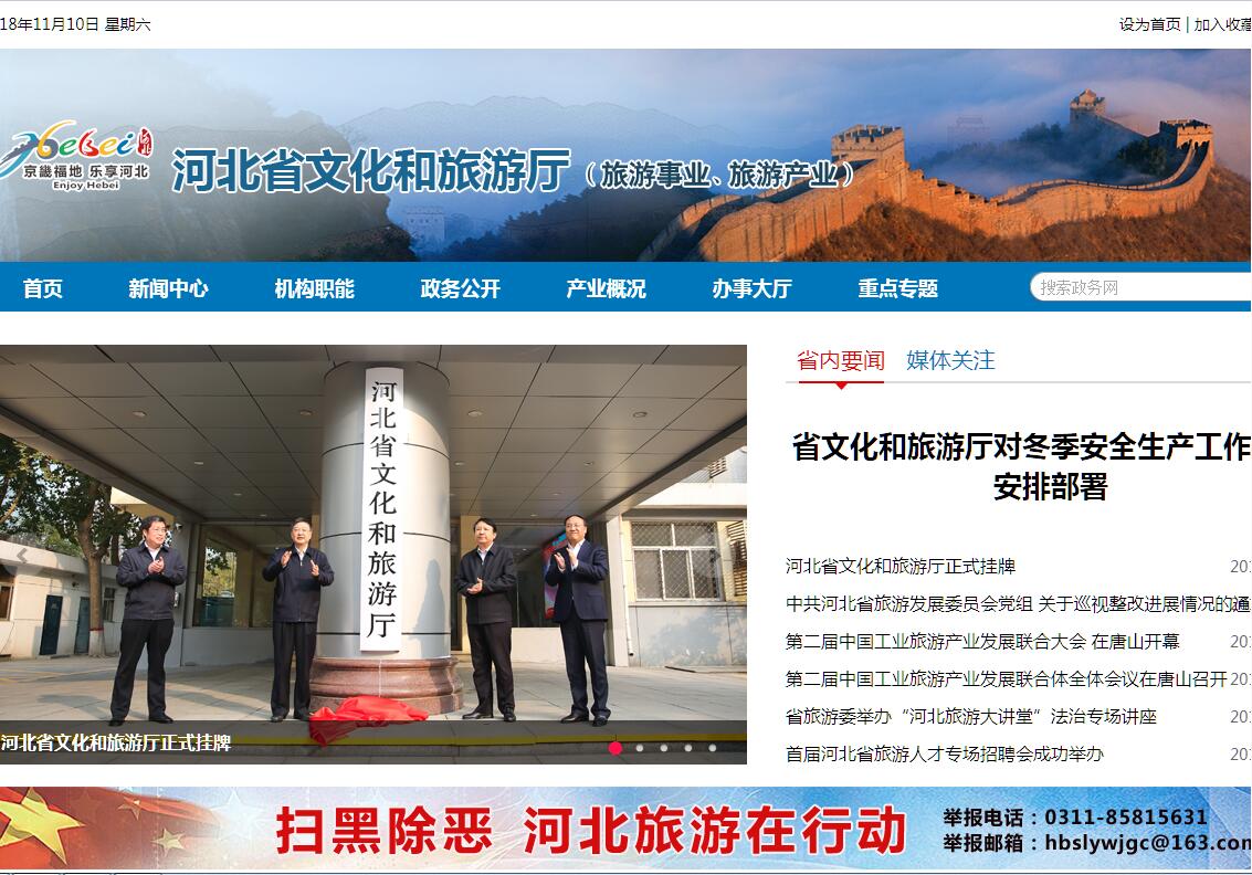 河北省文化和旅游厅是河北省机构改革中新成立的政府组成部门。据介绍,根据《河北省机构改革方案》安排部署,该省将省文化厅、省旅游发展委员会的职责整合,组建省文化和旅游厅,作为省政府组成部门。主要职责:(一)统筹全省旅游业的改革发展,拟订全省旅游业发展战略、规划、政策和措施并组织实施;拟订全省旅游人才发展规划;培育、引导和扶持全省旅游产业加快发展,组织构建具有较强竞争力的旅游产业体系。(二)贯彻落实国家发展旅游业的法律、法规、规章和政策;拟订全省旅游业相关的地方性法规、政府规章草案;对全省旅游经济运行情况进行监测,负责旅游统计和行业信息、新闻发布工作。(三)统筹协调全省相关产业部门间的旅游合作与融合发展;统筹省内跨区域旅游资源规划、开发、整合及利用;开展旅游对外交流与合作;推动京津冀旅游协同发展;承担省旅游工作领导小组办公室的日常工作。(四)拟订全省旅游市场开发战略并组织实施;参与国家或地区并组织本省旅游整体形象的对外宣传和重大旅游推广活动;组织协调重大旅游节庆和会展活动,培育旅游品牌;收集、发布国(境)内外旅游市场动态信息。(五)组织全省旅游资源普查、规划、开发和相关保护工作;指导全省重点旅游区域、旅游目的地和旅游线路的规划开发,引导社会资本投资旅游业;加大全省旅游重点项目建设统筹力度,会同有关部门开展旅游产业投资和重大旅游项目建设的协调、服务工作;促进旅游新业态发展和旅游带动就业及扶贫工作;协调和指导全省假日旅游和红色旅游工作。(六)负责全省旅游市场秩序和服务质量的监督管理,规范旅游企业和从业人员的经营和服务行为;建立健全旅游市场综合执法和联合执法机制,维护旅游消费者和经营者合法权益;负责全省旅游行业标准化工作,指导旅游行业组织的业务工作,综合协调旅游安全的监督管理;制定旅游行业突发事件应急预案并组织实施,与相关部门协调建立旅游应急救援体系。(七)协调推进全省旅游公共服务体系建设,指导智慧旅游、旅游集散、旅游公共信息、咨询服务体系和公共服务信息网络体系建设;组织协调旅游公共服务设施建设、改造和管理工作;推动旅游服务的便利化;指导旅游行业精神文明建设和诚信体系建设。(八)组织指导入境旅游和省内公民出境旅游工作;依法核准在我省设立外商投资旅行社相关业务、核发导游证、领队证;指导特种旅游相关工作。(九)指导全省旅游行业人才培养工作;承担导游从业人员资格核准相关工作,指导实施旅游从业人员职业资格标准和等级标准。(十)依法指导省旅游投资集团公司的业务工作。(十一)承办省政府交办的其他事项。