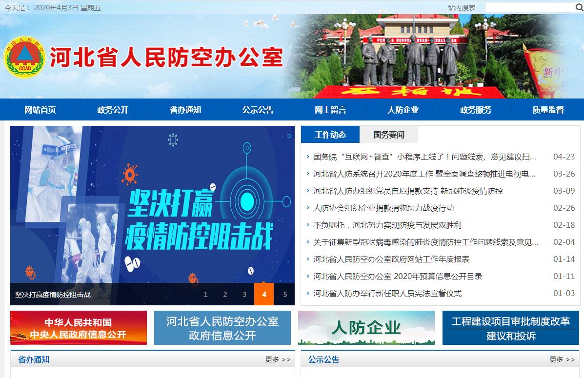河北省人民防空办公室(挂河北省民防办公室牌子),为省政府直属机构,也是河北省国防动员委员会的常设办事机构。其主要职责是:(一)负责人民防空法律法规的组织实施和监督检查;拟订全省人民防空(民防)工作地方性法规、政府规章草案;拟订全省人民防空事业发展规划,编制人民防空工作年度计划。(二)根据国家确定的人民防空重点城市防护类别、防护标准和城市发展情况,及时上报城市防护类别调整方案,经批准后组织实施;审核城市总体规划中贯彻落实人民防空要求情况;依法对城市和重要经济目标的人民防空建设进行指导和监督检查。(三)管理人民防空工程建设。组织编制人民防空工程建设规划;负责人民防空工程建设计划、技术、质量管理;指导监督人民防空工程维护与使用管理工作;参与城市地下空间规划和开发利用工作;组织指导利用人民防空工程和疏散地域(基地)建设防灾应急避难场所工作。(四)负责人民防空组织指挥工作。负责修订完善省级防空袭预案及各种保障计划,指导各地制定防空袭预案和各种保障计划并督导落实;拟订防空防灾演习计划(方案),经批准后组织实施;制定人民防空专业队伍(群众防空防灾组织)训练计划并督导落实;指导各地搞好疏散地域(基地)建设。(五)负责人民防空信息化建设。制定人民防空通信、警报建设规划及其保障方案并组织实施;协调利用军队和地方通信网保障人民防空通信警报工作;对人民防空指挥通信专网、空情接收网和警报网建设实施技术和质量管理,督促保障人民防空通信畅通;实施人民防空无线电管理;组织实施防空警报试鸣,落实利用防空警报发放灾情警报机制;建设人民防空信息系统和信息数据库,为防空防灾提供保障。(六)组织开展防空防灾宣传教育。制定人民防空宣传教育规划,会同有关部门开展防空防灾宣传教育,普及防空防灾知识,提高群众防护技能。(七)负责人民防空经费和资产管理工作。编制人民防空经费预决算并监督检查其使用情况;承担人民防空国有资产的清理、产权登记等管理工作。(八)组织开展人民防空科学技术研究、交流及成果应用;管理人民防空科研设计工作;根据国家制定的人民防空专用设备器材技术标准,指导人民防空专用设备器材的生产和引进。(九)协助管理各设区市人民防空部门领导干部的任免;组织开展人民防空干部教育培训,制定人民防空干部教育培训规划、计划并组织实施。(十)战时组织指挥城乡群众开展防空袭斗争。组织指挥群众进行疏散掩蔽,发放空袭警报,实施灯火管制,消除空袭后果,配合城市防卫、要地防空作战,协助有关部门组织恢复生产、生活秩序。(十一)承担省政府赋予的防灾救灾等应急保障任务。(十二)承办省委、省政府、省军区和省国防动员委员会交办的其他事项。
