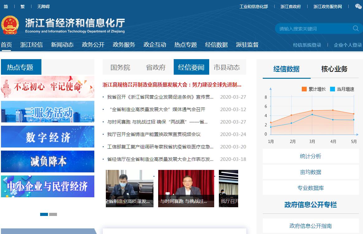 浙江省经济和信息化厅具体职责有:1、贯彻执行国家有关经济运行调节和信息化工作的方针政策和法律、法规;起草我省相关的地方性法规、规章草案和政策并组织实施;组织编制、实施工业和信息化的发展战略、中长期规划和年度计划;组织制订工业和信息化专项规划和行业规范,指导、监督、检查执行情况。2、监测分析全省经济运行态势,进行预测预警、信息引导,调节经济日常运行;拟订并组织实施近期经济运行调控目标、政策和措施,监测调控政策执行效果,协调解决经济运行中的重大问题并提出建议;负责工业、信息化应急管理和产业安全有关工作;组织重点物资的紧急调运(煤电油除外)和各种交通运输方式综合协调,协调全省春运工作。3、负责推进工业产业结构战略性调整,拟订相关的产业政策和发展规划,推进信息化和工业化融合发展,优化全省工业、信息产业布局,推动软件业、信息服务业和新兴产业的发展,指导产业转型升级,制定并组织实施产业结构调整实施方案,牵头提出工业转型升级专项资金使用的重点领域和方向;按照分工承担全省工业、信息产业园区的有关工作,协调推进工业园区、块状经济和产业集群发展,组织培育区域品牌。4、负责全省企业技术改造投资管理工作,拟订产业投资规模和结构调控目标、政策及措施;申报、核准、备案企业技术改造(含利用外资)项目;负责中央和省财政有关专项资金项目的申报、组织实施和督查工作;承担技改投资项目进口和国产相关设备抵免税审核确认工作;监督企业技术改造项目招投标活动;参与制定投资体制改革方案和重大工业建设项目投资的有关工作。5、指导企业技术创新和技术进步,提出相关的政策,组织实施国家和省有关重大技术攻关项目,推进企业技术创新体系和能力建设,培育企业技术中心,负责组织实施重大装备国产化和重大技术装备、应对技术壁垒专项,推动企业技术引进、新产品开发和高新技术产业化;组织协调相关的产学研合作创新,参与指导企业知识产权工作。6、负责拟定并组织实施工业、信息化领域的能源节约和资源综合利用、清洁生产促进政策;推进工业循环经济、清洁生产,培育和发展技能环保等新兴产业;指导新型墙体材料的生产及推广应用。7、牵头协调指导工业和信息化企业发展生产性服务业工作,研究提出相关政策措施,推进制造业和服务业融合发展,推进生产性服务业功能区和公共服务平台建设;指导企业积极发展科技服务业、现代物流业、国际贸易、文化创意产业和售后服务业等,指导总部经济、楼宇经济发展。8、指导工业和信息化企业市场拓展和合作交流,协调和指导工业和信息化引进内资工作;开展工业、信息化的对外合作交流;参与开展区域产业协作。9、负责工业和信息化行业管理工作,提出工业和信息化行业规划和相关政策,协调工业和信息化行业发展中的重大问题;承担产业信息发布和相关行业准入许可事项;推进工业和信息化行业淘汰落后生产能力工作;管理和指导相关行业协会工作;负责省级医药储备管理工作;协调全省茧丝绸工作。10、指导各种经济成分的工业信息化企业,规范企业行为规则;制定并组织实施培育发展大企业大集团、行业龙头企业的政策、措施;组织协调企业治乱减负工作;指导企业管理创新和现代企业制度建设;组织实施企业经营管理人员素质提升工程,推进企业管理咨询资质认定。11、统筹推进工业领域信息化发展;研究拟订信息化和工业化融合发展战略,提出政策建议;指导推进工业数字化、智能化、网络化制造和应用;研究推进工业互联网发展,推进制造业数字化转型。推进信息技术在经济和社会领域应用与发展,开展信息化考核督查工作。协调推进信息技术公共服务平台建设等工作。指导推进智慧城市(城市大脑)建设。牵头落实世界互联网大会信息化工作部相关工作。承担省信息化工作领导小组办公室和省两化深度融合国家示范区建设领导小组办公室日常工作。12、统筹指导工业领域工业控制系统信息安全;指导、监督重要工业领域工控系统信息安全;监督管理电子签名认证证书的发行、使用(法人数字证书服务采购)等。13、按照规定权限,负责全省信息网络设施建设,制定相关的规划并协调管理,组织推进通信网、广播电视网和计算机网等“多网”融合发展;指导推进全省政务和社会公共服务信息资源开发利用工作。14、贯彻执行无线电管理法律法规、规章和方针政策,起草全省无线电管理地方性法规、规章草案和政策并组织实施;按照规定权限配置和管理无线电频谱资源;负责无线电管理行政许可事项;负责组织无线电监测、检测,协调处理无线电干扰,依法组织实施无线电管制;负责管理全省无线电管理派出机构。15、负责国防科技工业的综合协调和管理。组织协调、督促检查国家下达的国防科技工业高新工程、专项计划和军品科研、生产任务的实施,并提供保障服务;审核报批武器装备科研生产许可,承担相关的保密资格审查认证,监督管理军品市场;组织指导民用部门军品配套工作,实施军民两用技术双向转移和产业化,指导军民结合产业基地发展工作。负责民爆器材行业管理和生产经销环节的安全监管工作。16、综合协调和指导服务中小企业(乡镇企业)发展,提出促进中小企业发展的政策措施,协调解决重大问