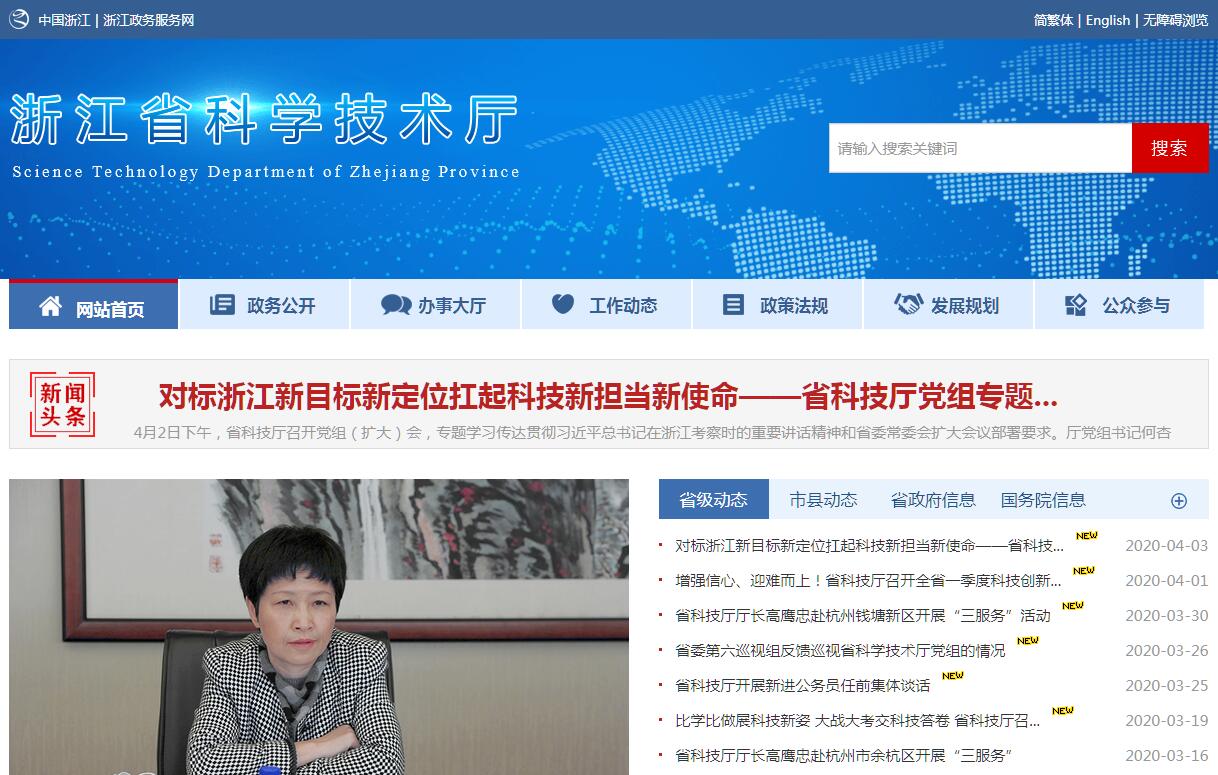 浙江省科学技术厅是浙江省主管科技工作的省政府组成部门。其主要职责是:(一)牵头拟订全省中长期科技发展规划和科技工作方针、政策,起草相关地方性法规、规章草案,经审议通过后组织实施。(二)负责组织制定和实施全省科技创新环境营造、人才培养、条件建设和研发支持等方面的各类科技计划,负责统筹协调全省科学技术基础研究、应用研究、成果转化,会同有关部门做好产业化工作,牵头组织实施重大科技专项;指导省自然科学基金委员会工作;会同有关部门做好科技投融资体系建设工作。(三)会同有关部门拟订全省科技体制改革和科技创新的政策和措施,负责全省科研院所体制改革和相关科研机构的组建和调整,指导技术市场、科技中介机构、民营科技机构和科技社团工作,拟订全省科普规划和政策,负责全省科技宣传信息和软科学研究管理工作。(四)负责组织制定全省企业科技研发机构、重点实验室、科技孵化器、区域科技创新服务中心等各类科技创新载体和重大科技创新平台的规划,并组织实施和管理。(五)会同有关部门拟订高新技术产业化政策和措施,审核、指导高新技术产业开发区、高新技术特色产业基地等各类科技园区建设。(六)负责拟订和实施科技促进工业、农业、服务业发展的政策和措施。(七)加强与中科院、工程院、高校院所、国防科技系统等各方面的科技合作,会同有关部门拟订和实施产学研结合的相关政策,促进联合攻关和科技成果转化推广应用。(八)负责本部门预算中的科技经费预决算及经费使用的监督管理,会同有关部门提出科技资源合理配置重大政策和措施建议,优化科技资源配置。(九)负责拟订全省科技成果推广的政策和措施,做好科技成果管理和科技奖励评审的组织工作。(十)协同有关部门做好科技人才培养和引进工作,提出相关政策建议。(十一)在授权范围内,负责管理全省科技外事工作,组织拟订国际科技合作和交流政策,制定和实施相关计划,受委托审批或报批出国(境)科技团组;会同有关部门组织国内外先进技术引进、消化吸收和技术出口工作。(十二)牵头拟订全省知识产权发展规划、方针、政策;负责组织协调全省知识产权保护工作,开展专利行政执法工作,承担规范专利管理基本秩序的责任,负责全省专利信息公共服务体系建设和专利代理等中介服务机构的管理工作,负责全省知识产权法律法规的宣传、培训工作。(十三)指导协调省政府各部门与各市、县(市、区)的科技和知识产权管理工作;会同有关部门组织实施科技强省和知识产权战略,推动各地区、各行业科技进步。(十四)承办省政府交办的其他事项。