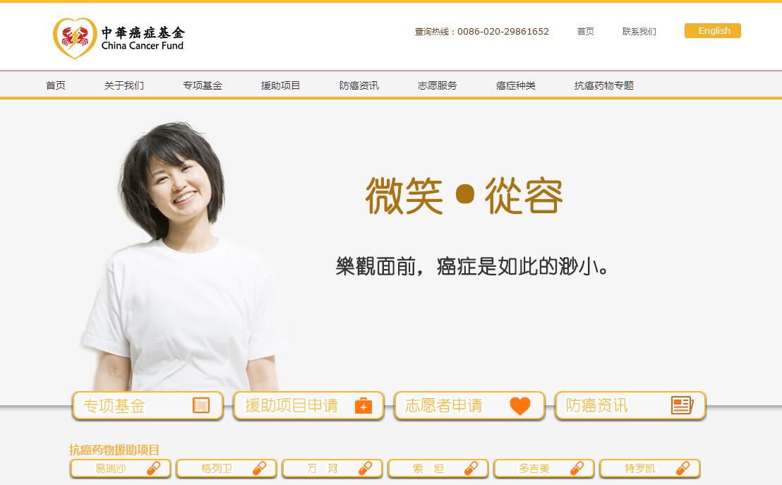 | 网站简介: 中华癌症基金是致力于全球华人癌症防治及救助活动的非公募性慈善机构。其登记管理机关是香港警务署,业务主管单位是香港民政事务局。中华癌症基金会恪守宗旨,积极倡导慈善爱国、造福社会的理念,摒弃一切的官僚作风,以透明、高效的运作模式,向癌症患者提供有效的帮助,让人们从容地应对癌症。现正式启动多个大规模的慈善赠药活动:易瑞沙援助项目、多吉美援助项目、格列卫援助项目、特罗凯援助项目、万珂援助项目、索坦援助项目。 |