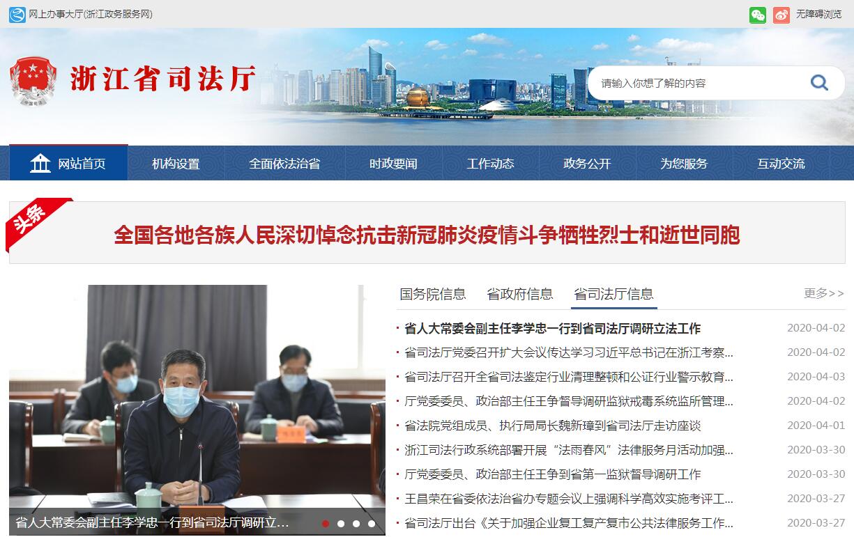 浙江省司法厅是主管司法行政工作的省政府组成部门。其主要职责是:(一)贯彻执行国家司法行政工作方针、政策、法律、法规和规章,起草司法行政地方性法规、规章草案;制定司法行政中长期规划并监督实施。(二)指导监督全省监狱执行刑罚、改造罪犯的工作。(三)负责全省司法行政系统戒毒管理工作并承担相应责任。(四)指导管理全省社区矫正工作。(五)拟订全省法制宣传与普法教育的规划并组织实施;指导各地区、各行业法制宣传、依法治理和对外法制宣传工作。(六)指导监督全省律师、基层法律服务、公证工作;综合管理社会法律服务机构和在我省设立的国外(境外)律师机构。(七)指导全省司法行政机关管理基层司法所和人民调解、帮教安置工作;参与社会治安综合治理工作。(八)指导监督全省司法行政系统依法行政工作;参与省内有关司法行政立法工作;负责仲裁委员会的登记;指导全省司法行政涉港澳台法律事务。(九)负责全省司法鉴定人和司法鉴定机构的登记管理工作。(十)监督管理全省法律援助工作;指导协调全省“12348”法律服务工作。(十一)组织实施全省国家司法考试工作。(十二)指导全省司法行政系统队伍建设、基层党建和思想政治工作;指导司法行政高等职业教育工作;管理省属监狱、戒毒系统和直属高校领导班子,协助市委管理司法行政机关领导干部;配合做好法律服务等专业技术职务的评审工作;负责全省司法行政系统的警务管理和警务督察工作。(十三)负责厅直属单位的内部审计工作和省属监狱、戒毒系统厅管干部的经济责任审计工作;指导全省司法行政系统的内部审计工作。(十四)指导协调全省司法行政系统的信息化建设;指导管理全省司法行政系统外事工作;承办国际有关对口部门的往来业务,开展政府和民间的法律交流与合作。(十五)指导管理全省司法行政系统警务物资装备。(十六)承办省政府交办的其他事项。
