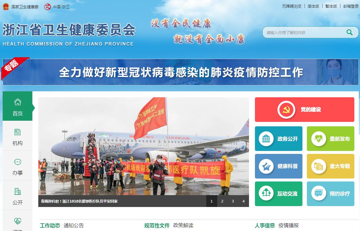 浙江省卫生健康委员会主要职责:(一)组织拟订全省国民健康政策,拟订卫生健康事业发展地方性法规、规章草案和政策、规划,制定地方标准和规范并组织实施。统筹规划卫生健康资源配置,指导市县卫生健康规划的编制和实施。制定并组织实施卫生健康基本公共服务均等化、普惠化、便捷化和公共资源向基层延伸等政策措施。(二)协调推进深化医药卫生体制改革,研究提出深化医药卫生体制改革重大方针、政策、措施的建议。组织深化公立医院综合改革,推进管办分离,健全现代医院管理制度,加强公立医院党的建设,制定并组织实施推动卫生健康公共服务提供主体多元化、提供方式多样化的政策措施,提出医疗服务和药品价格政策的建议。会同有关部门制定并实施健康服务业发展的政策措施。(三)制定并组织落实疾病预防控制规划、免疫规划以及严重危害人民健康公共卫生问题的干预措施。负责卫生应急工作,组织指导突发公共卫生事件的预防控制和各类突发公共事件的医疗卫生救援。(四)组织拟订并协调落实应对人口老龄化政策措施,负责推进老年健康服务体系建设和医养结合工作。(五)组织实施国家基本药物政策和国家基本药物制度,开展药品使用监测、临床综合评价和短缺药品预警,提出我省基本药物价格政策的建议。开展食品安全风险监测,依法制定并公布食品安全地方标准,组织指导食品安全企业标准备案工作。(六)负责职责范围内的职业卫生、放射卫生、环境卫生、学校卫生、公共场所卫生、饮用水卫生和传染病防治等公共卫生的监督管理,健全卫生健康综合监督体系。承担《烟草控制框架公约》履约的全省牵头工作。(七)制定医疗机构、医疗服务行业管理办法并监督实施,建立医疗服务评价和监督管理体系。负责卫生健康行业安全生产监督管理工作。会同有关部门组织实施卫生健康专业技术人员资格标准。制定并组织实施医疗服务规范、标准和卫生健康专业技术人员执业规则、服务规范。指导推动医疗机构、公共卫生机构质量管理和品牌培育。(八)负责计划生育管理和服务工作,开展人口监测预警,研究提出人口与家庭发展相关政策建议,完善计划生育政策。(九)指导基层卫生健康工作,指导基层医疗卫生、妇幼健康服务体系和全科医生队伍建设。推进卫生健康科技创新发展。(十)组织制定中医药、民族医药发展规划,并纳入卫生健康事业发展总体规划,负责中医药的继承、创新和中西医结合工作,统筹协调中西医发展。(十一)负责来浙中央领导、重要外宾以及省保健对象的医疗保健工作,负责国家和省重要会议与重大活动的医疗卫生保障工作。(十二)完成省委、省政府交办的其他任务。