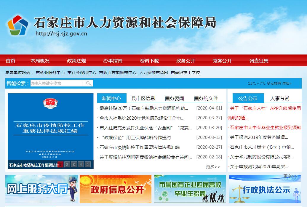 石家庄市人力资源和社会保障局主要职责:(一)拟订全市人力资源和社会保障事业发展规划,起草人力资源和社会保障地方性法规、政府规章草案。(二)拟订人力资源市场发展规划和人力资源服务业发展、人力资源流动政策,促进人力资源合理流动、有效配置。按照管理权限拟订人员(不含公务员)调配政策和特殊人员安置政策。(三)负责促进就业创业工作,拟订统筹城乡的就业发展规划和促进就业创业扶持政策,完善公共就业服务体系,拟订全市技工学校和职业培训机构发展规划和管理规划并组织实施,统筹建立面向城乡劳动者的职业技能培训制度,加强就业服务和就业培训,拟订就业援助制度,牵头拟订高校毕业生就业政策,按规定负责中专以上毕业生(非师范类)的就业工作。(四)统筹推进覆盖城乡的多层次社会保障体系建设。负责养老、失业、工伤等社会保险及其补充保险工作。负责养老、失业、工伤保险关系转续和基金统筹管理工作,会同有关部门拟订养老、失业、工伤保险及其补充保险基金管理和监督制度。审核汇总相关社会保险基金预决算草案。负责企业年金、职业年金管理工作,会同有关部门实施全民参保计划并参与全省统一的社会保险公共服务平台建设工作。(五)负责就业、失业和相关社会保险基金预测预警和信息引导,拟订应对预案,实施预防、调节和控制,保持就业形势稳定和社会保险基金总体收支平衡。(六)负责劳动人事争议调解仲裁和劳动关系监管工作,完善劳动关系协商协调机制,组织实施职工工作时间、休息休假和假期制度。负责消除非法使用童工和女工、未成年工的特殊劳动保护工作。组织实施劳动保障监察,协调劳动者维权工作,依法查处重大案件。(七)拟订人才工作有关目标并做好相关实施工作,参与全市人才工作的指导、组织、协调和管理,承办有关人才工作。会同有关部门做好市场化、社会化的人才管理服务体系建设工作。负责人事考试工作。负责人才分类评价机制推进实施,牵头推进全市深化职称制度改革,综合管理全市职称工作。负责专业技术人员管理、继续教育和博士后管理工作,负责高层次专业技术人才选拔和培养,拟订吸引留学人员来石(回国)工作或定居政策,组织拟订技能人才培训、评价、使用和激励制度。贯彻执行职业资格制度,负责职业技能多元化评价工作。(八)会同有关部门指导事业单位人事制度改革,按照管理权限负责规范事业单位岗位设置、公开招聘、聘用合同、考核奖惩、培训等人事综合管理工作,负责事业单位人员和机关工勤人员管理工作;按照管理权限负责市直部分事业单位及中央驻石单位工资基金手册管理工作。(九)负责全市评比达标表彰和创建示范工作的综合管理、审核备案、监督检查工作。会同有关部门拟订全市表彰奖励办法(不含中国共产党党内表彰、公务员奖励),组织指导市直各部门的评比达标表彰活动,负责全市功勋荣誉表彰奖励获得者管理工作,落实享受待遇的相关政策。(十)会同有关部门做好全市事业单位人员工资收入分配管理工作,负责国有企业管理人员薪酬水平的复核、备案工作;负责企事业单位人员工资决定、正常增长和支付保障工作;负责全市企事业单位人员福利和离退休管理工作,并对政策执行情况进行监督检查。(十一)负责农民工工作,对政策落实情况进行监督检查,协调解决重点难点问题,维护农民工合法权益。(十二)负责人力资源和社会保障对外交流与合作工作。(十三)完成市委、市政府交办的其他任务。
