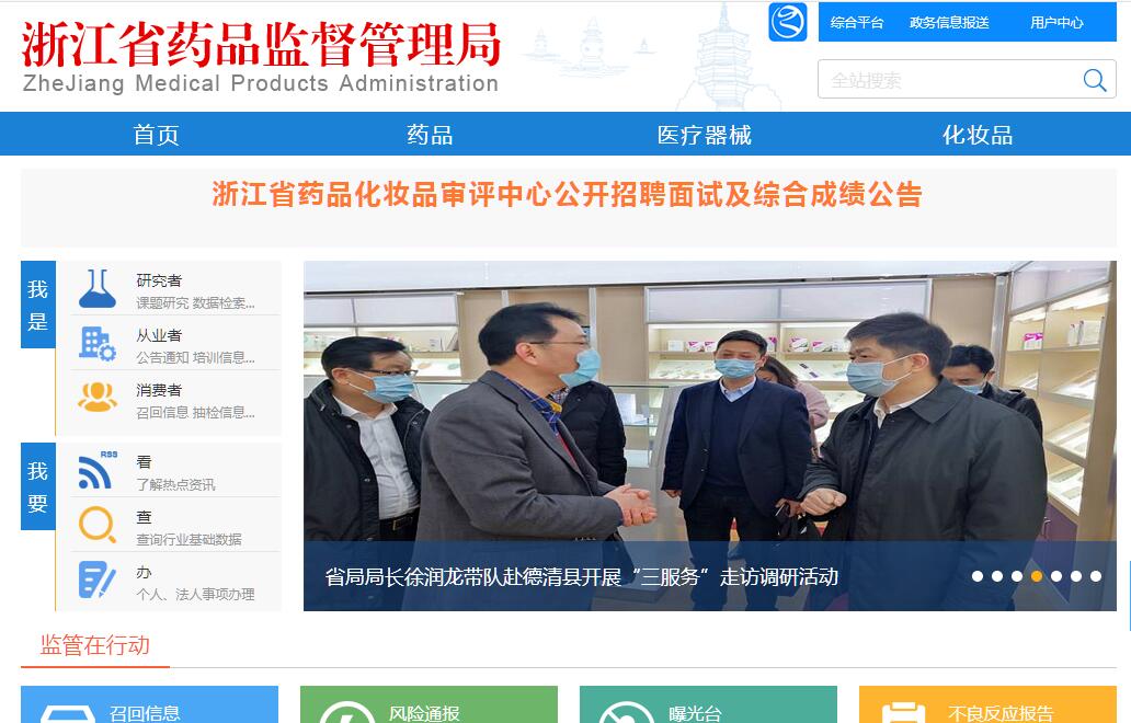 浙江省药品监督管理局主要职责:一、负责药品(含中药、民族药,下同)、医疗器械和化妆品安全监督管理。组织起草相关地方性法规、规章草案,制定相关政策、规划。组织实施国家鼓励药品、医疗器械、化妆品新技术新产品管理和服务政策。二、监督实施国家药品、医疗器械和化妆品的标准、技术规范和分类管理制度。组织制定中药饮片炮制规范、医疗 机构制剂质量标准和地方药材标准。组织实施中药品种保护制度。配合实施国家基本药物制度。三、组织开展药品、医疗器械和化妆品注册相关工作。组织实施药品、医疗器械和化妆品生产环节许可以及药品批发许可,指导并监督实施质量管理规范。指导药品、医疗器械行业生产经营企业做好生态环境保护和污染防治工作。四、组织实施药品、医疗器械和化妆品上市后风险管理。组织开展药品不良反应、医疗器械不良事件和化妆品不良反应的监测、评价和处置工作,监督实施产品召回制度。组织开展药品、医疗器械和化妆品质量抽查检验并发布质量公告。依法承担药品、医疗器械和化妆品安全应急管理工作。配合有关部门督促药品、医疗器械、化妆品行业生产经营单位做好安全生产工作。五、组织制定检查制度,并依职责组织实施。依职责组织查处药品、医疗器械和化妆品生产经营环节的违法行为,组织查处跨区域和重大复杂案件。负责药品、医疗器械和化妆品投诉举报的处理工作。推进专业化、职业化检查员队伍建设。六、组织实施执业药师资格准入制度,指导监督执业药师注册工作。七、推进全省药品、医疗器械和化妆品安全信用体系和技术支撑体系建设,指导监督检验检测、审评和监测机构业务工作。八、指导监督市县市场监督管理部门药品、医疗器械、化妆品监督管理工作。九、完成省委、省政府交办的其他任务。