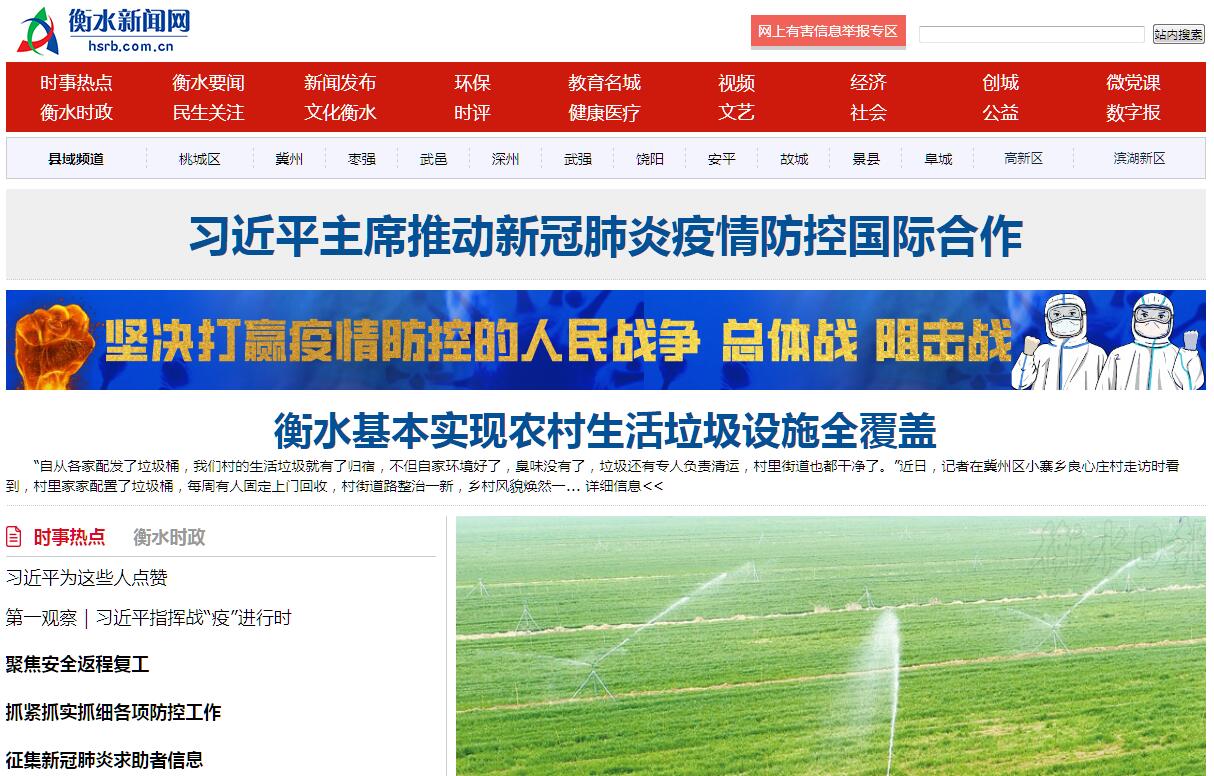 衡水新闻网(www.hsrb.com.cn),是《衡水日报》《衡水晚报》电子版,数字报。隶属衡水日报社。是衡水市唯一的河北省重点新闻网站。权威媒体。门户网站。衡水市目前最大的网上新闻发布中心,衡水市对外对内新闻宣传的重要窗口。是百度新闻源提供媒体,搜狗、谷歌新闻源提供媒体。2012,获“全国地方网站十佳特色品牌”、“河北省文明网站”;2013年,获“全国地方网站最具广告效力品牌奖”;2017年度河北省互联网违法和不良信息举报工作先进单位。根据IP地址地区属性对应分析,衡水新闻网的访问者中本市占75%,外埠占20%,国外占5%。PC阅读量占30%,手机端阅读占70%。衡水新闻网以刊载国内外、本地重要新闻为主。形式大气,内容及时,是衡水最好的新闻网站。读者可以通过网站的数字报栏目,免费阅读最新的《衡水日报》和《衡水晚报》。也可以在衡水新闻网上查阅资料,搜索、阅读衡水新闻,当成生活的重要内容。衡水新闻网在向“成为全市人民群众文化生活的良师益友”的既定目标前进。《衡水日报》国内统一刊号:CN13-0012,《衡水晚报》国内统一刊号:CN13-0032。衡水新闻网专注于实用信息建设,由房产频道、汽车频道、财经频道、教育频道、健康频道、娱乐频道、求职频道等组成。各频道访问量及影响力均在衡水地区行业网站、频道中居首。即将开通的衡水社区,将拥有论坛、博客、微博、播客、换客、相册等多种产品,论坛栏目涵盖社会生活的方方面面,将建成全省最有影响力的区域综合门户论坛之一。衡水新闻网技术先进,编辑记者力量雄厚。衡水日报社百余名编辑记者为本网站的新闻提供采写和编辑服务。他们有:刘彦成、赵胜华、李辉、崔亚力、刘海江、吕文兵、刘玉、宋少华、王常荣、李红岩、贾亚楠、袁冬雪、戴靖霄、王书文、刘振清、陈幸祉、刘金桥、郑国平、杜静、段文雅、胡昕、孔颖、尹昊、张月亭、李雅洁、李国涛、徐鹏璐、李子博等等。衡水网友藏龙卧虎,能量惊人。论坛将坚持民间角度,草根文化,坚持社会主流价值观,为网民提供了一个娱乐休闲畅所欲言的平台。