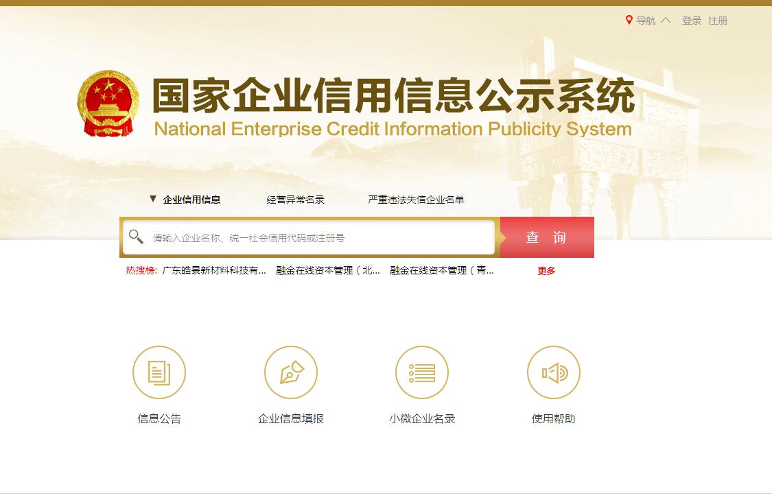 | 网站简介: 国家企业信用信息公示系统由中华人民共和国国家市场监督管理总局主办。全国企业信用信息公示系统(国家企业信用信息公示系统)于2014年2月上线运行。公示的主要内容包括:市场主体的注册登记、许可审批、年度报告、行政处罚、抽查结果、经营异常状态等信息。 |