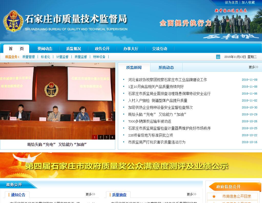 石家庄市质量技术监督局负责本行政区域内的质量技术监督和行政执法工作,领导所属单位开展各项质量技术监督业务。其主要职责是:(一)拟定提高质量水平的发展规划并组织实施,起草质量技术监督方面的地方性法规、规章草案,负责与质量技术监督有关的技术规范工作。(二)负责质量工作。拟定质量发展规划并组织实施,推进名牌发展战略和产品质量诚信体系建设工作,会同有关部门做好重大工程设备质量监理工作,组织重大产品质量事故调查,实施缺陷产品和不安全产品召回制度,监督管理产品防伪工作。(三)负责产品质量监督工作。组织开展产品质量安全强制检验、监督抽查等工作,负责工业产品生产许可证管理,纤维及纤维制品监督检验,生产领域食品相关产品生产加工的质量监督管理工作,按照有关规定,对产品质量仲裁检验、依法查处产品质量违法行为,根据分工打击假冒伪劣违法活动,组织协调有关专项打假活动。(四)负责监督管理标准化工作。贯彻工作和省标准化工作的法律、法规、方针、政策并制定具体实施办法,拟定全市标准化工作的规划、计划,对标准实施情况进行监督,指导有关行政主管部门的标准化工作,组织制定市级农业地方标准,管理企业产品标准备案,监督企业按标准组织生产,管理全市组织机构代码和商品条码工作。(五)负责计量工作。推进法定计量单位和国家计量制度,管理和监督地方计量标准和标准物质,依法管理计量器具,组织本地量值传递和对比工作,监督管理商品量、市场计量行为和计量仲裁检定。(六)负责认证认可工作。依法对全市实验室和检查机构进行监督管理,对认证认可相关的社会中介服务机构实施资格认可和监督管理,协调和监督强制性认证和自愿性认证工作,引导企业按国际惯例进行各种认证。(七)负责特种设备安全检查工作。依法对特种设备的生产(包括设计、制造、安装、改造、修理)、经营、使用、检验、检测等环节进行行政许可和安全监察,按规定权限组织特种设备事故的调查处理工作,承担综合管理特种设备安全监察、监督工作的责任;监督检验高耗能特种设备节能标准的执行情况。(八)拟定质量技术监督和科技发展和技术机构建设规划并组织实施,组织有关科研和技术引进工作。(九)承办市政府交办的其他事项。