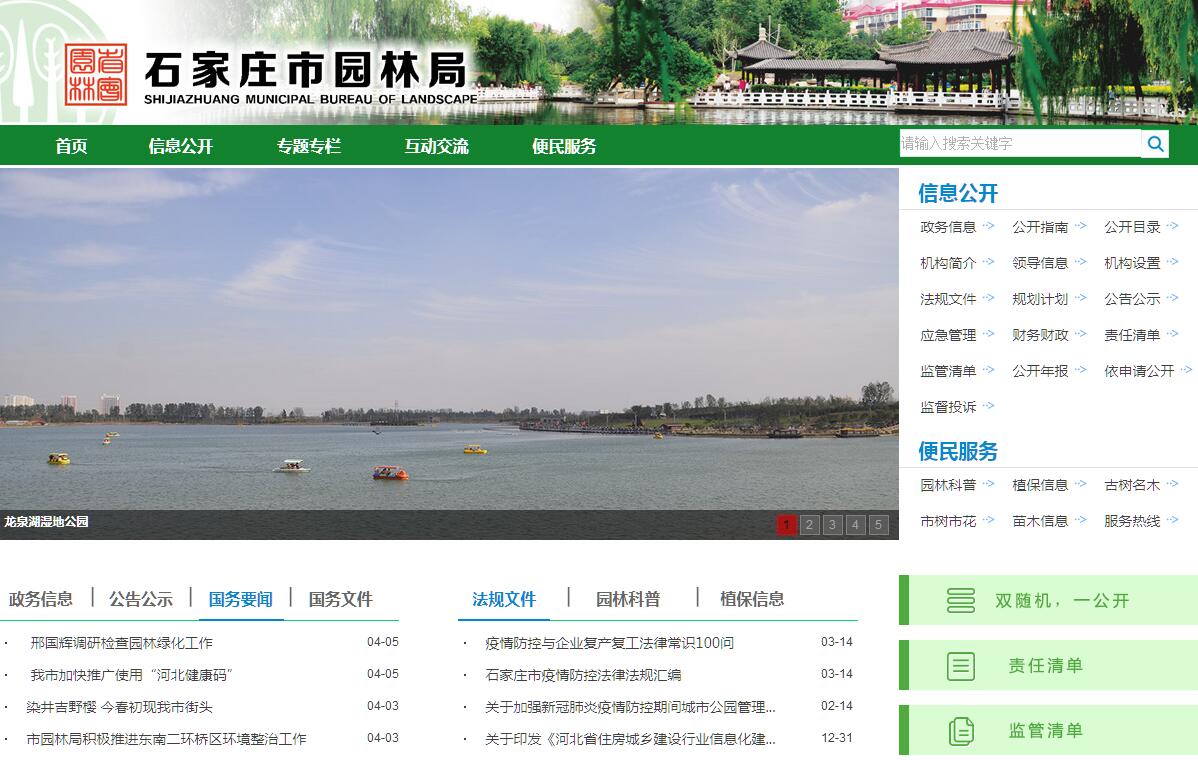 石家庄市园林局主要职责:1. 贯彻落实上级有关园林绿化的方针、政策、法律、法规和规章;联系实际提出制定、修改园林绿化法律、法规的意见和建议。2. 负责编制实施城市绿地系统规划;组织制定城市园林绿化发展规划、年度计划,并组织实施。负责园林绿化、公园广场及水系综合管护的检查、考核、督导工作。3. 参与建成区主要街道、公园、广场和有关防护林区的规划、设计、建设和管理;负责市内公园、广场及水系经营项目和活动的审批和实施。4. 依照《城区河系公园管理条例》,负责民心河、太平河及环城水系的建设和管理。5. 执行城市绿化“绿线”管制制度;监督检查城市各类绿地的达标情况;审批、验收城市建设项目中的园林绿化比例和布局;申报和审批建城区内占用绿地、伐移树木等事项。6. 管理、监督、检查园林绿化行政执法工作和专业培训、考核工作。7. 制定园林绿化养护的质量等级、定额标准和古树名木保护等级标准,组织园林绿化工程建设招标、质量监督、安全生产及工程验收。8. 会同有关部门负责建成区园林绿化工程立项、融资及各种专项费用的使用、管理和监督检查工作。9. 负责制定园林绿化科技发展规划、科研计划并组织重点科研项目试验研究;组织科技成果鉴定、申报和推广工作。10. 参与市建成区圃地、花木市场的规划、建设和管理;负责进入城区苗木花卉的检疫及苗木花卉病虫害的预测预报。11. 指导城市规划区和风景名胜区的园林绿化工作;参与组织和协调全民义务植树活动。12. 负责全市园林绿化施工单位的资质审核和申报工作;负责园林行业的管理;负责外地进市从事园林施工单位的资质审核、办理进市登记及市场准入手续。13. 承办市政府交办的其它事项。