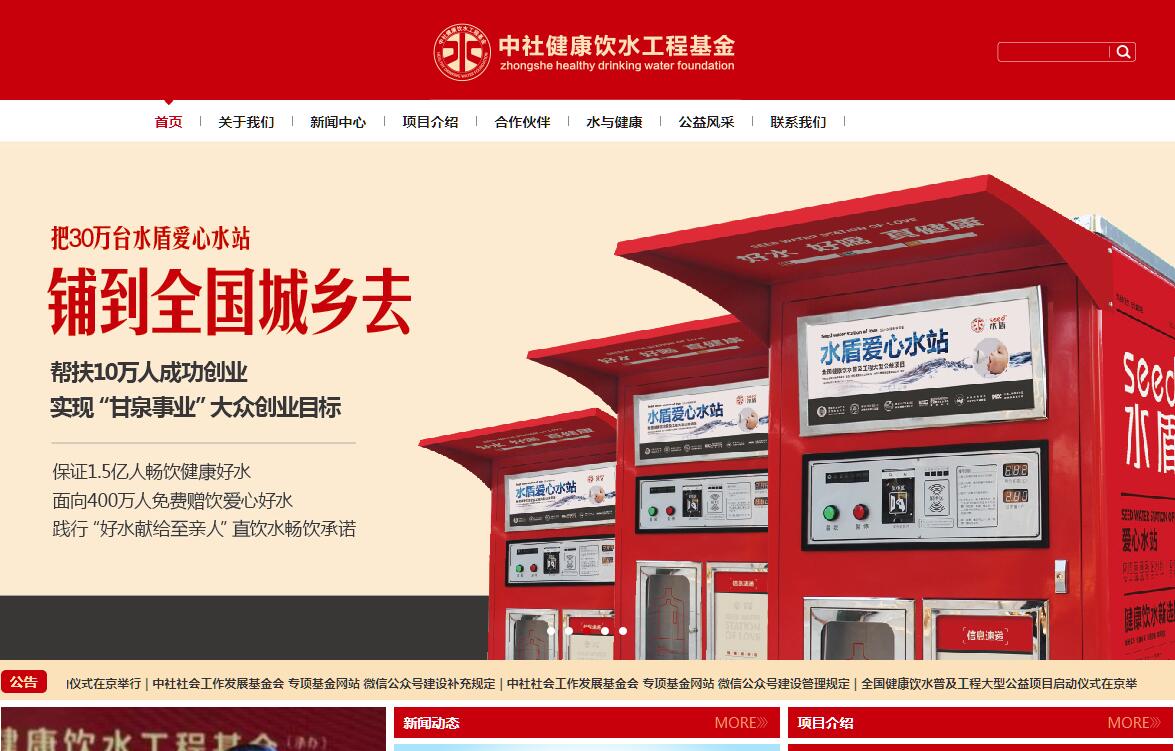 中社社会工作发展基金会健康饮水工程基金,简称“中社健康饮水工程基金”,是中国社会工作发展基金会设立的专项基金之一,受民政部的指导和监督。此项基金的设立旨在通过团结社会各界爱心力量,呼吁珍惜水资源,共同保护水源地,科学治理水污染,有效改善水环境,充分保障水安全,真正让百姓喝上健康水、用上安全水。基金所筹款项将完全用于公益饮水工程项目的开展和推广、全民健康饮水观念的宣传和普及。此项基金将紧紧围绕“喝健康水、强东方龙、圆中国梦”这一主题,在不同时间、不同地点,针对不同人群,持续性、高频率、大范围地开展一系列公益活动。以此,充分发挥基金的公益功能、带动功能和社会效益。具体活动项目如下:1.组织开展“水与健康”知识讲座,在各城市、乡村普及健康饮水知识和科学环保理念。2.组织开展“甘泉事业”大众创业扶持公益活动,设立“健康饮水工程专项创业扶持基金”,扶持复转军人、待业大学生、下岗职工、残疾人员、农业转移人口和其他创业人员以净水事业为职业,大胆创业、成功创业,在成就他们个人财富梦想的同时,在全国范围内建立起一个有公益之心、有专业技能、有合作共识的净水服务网络。3.组织开展 “好水献给至亲人” 捐赠活动,通过普及自动售水站的方式,为水站所在小区(村镇)居民低价提供优质直饮水的同时,免费为该小区(村镇)全国劳模、军烈属、老年人、婴儿家庭赠送优质直饮水。4.参与水污染严重、水源性地方病多发地区的水污染治理工作,重点扶持国家贫困地区和革命老区的水源治理及净水设备的普及。5.实施国家突发性重大地质灾害救援的应急方案。6.整合优势资源,努力扶持“全国健康饮水普及工程”的试点工程和样板单位,并尽快予以模式复制和经验推广。水资源的科学保护和合理利用是一项可让人人受益的健康产业,也是一项需要人人参与的社会事业,更是一项关乎国计民生的安邦大业!中社健康饮水工程基金将会为推动此项事业的发展,集聚强大的力量和发挥重要的作用。