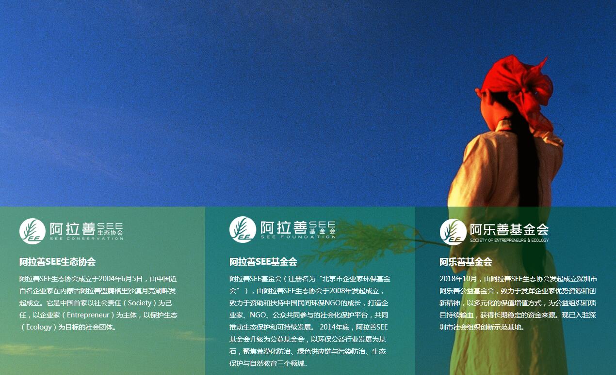 阿拉善SEE生态协会成立于2004年6月5日,是中国首家以社会责任为己任,以企业家为主体,以保护生态为目标的社会团体。2008年,阿拉善SEE生态协会发起成立阿拉善SEE基金会(注册名为“北京市企业家环保基金会”),致力于资助和扶持中国民间环保公益组织的成长,打造企业家、环保公益组织、公众共同参与的社会化保护平台,共同推动生态保护和可持续发展。2014年底,阿拉善SEE基金会升级为公募基金会,以环保公益行业发展为基石,聚焦荒漠化防治、绿色供应链与污染防治、生态保护与自然教育三个领域。阿拉善SEE生态协会历任会长:刘晓光、王石、韩家寰、冯仑、任志强、钱晓华、艾路明;阿拉善SEE基金会历任理事长:吴敬琏、许小年。发展至今,阿拉善SEE成立了18个地方项目中心,企业家会员超过900名;直接或间接支持了450多家中国民间环保公益机构或个人的工作。未来,阿拉善SEE将进一步带动和整合企业家及社会资源投入,号召公众的广泛支持和参与,充分发挥社会化保护平台价值,共同守护碧水蓝天。阿拉善SEE先后获得民政部颁发“全国先进社会组织”、“北京市社会组织示范基地”、“中欧十佳绿荫基金会奖”、“中国社会组织评估等级5A级”等荣誉。阿拉善SEE是中国最透明基金会之一,在基金会中心网基金会透明指数(FTI)荣获满分,公益支出在北京市满分基金会中排名第一。