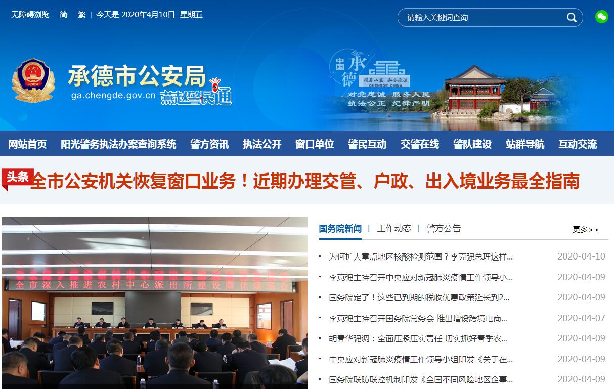承德市公安局既是对全市公安工作和队伍建设进行管理、组织和协调的领导机关,又是直接指挥和参与侦破危害国家安全案件、重大刑事案件和经济犯罪案件,查处治安案件,处置突发事件,管理社会治安的实战部门。其主要职责是:一、按照市委、市政府和省公安厅的指示,研究部署和组织实施全市公安工作,并督促检查执行情况。二、研究建立社会主义市场经济体制过程中公安工作遇到的新情况新问题,制定新措施,推进全市公安工作的改革和发展。三、搜集、掌握影响稳定、危害国家安全和社会治安的有关情况,分析形势,制定对策,适时组织实施。四、指导对危害国家安全案件、刑事案件、经济犯罪案件、涉毒案件的侦查工作,直接侦办重特大案件,打击恐怖活动。五、指导全市公安机关依法查处治安案件,组织、协调、参与处置重大突发事件和治安事故;承担特种行业等管理工作;负责全市食品药品安全保卫工作。六、指导、监督全市公安机关对国家机关、社会团体、企事业单位、重点建设工程的治安保卫工作。七、组织实施消防工作,依法进行消防监督,加强应急抢险救援能力建设。八、组织指导出境、入境和外国人在市内居留、旅行的有关管理工作。九、组织指导全市公安机关做好来我市的党和国家领导人、重要外宾的安全警卫工作;指导警卫部队建设。十、负责全市收押场所及监视设备的建设和管理;组织对在押人员的监管、教育工作。十一、指导、监督全市公安机关执法活动;负责全市劳教审批工作;组织全市公安机关的行政复议工作。十二、指导、组织全市公安机关维护道路交通安全、交通秩序以及对机动车辆、驾驶员的管理工作。十三、组织全市公安科学技术工作;规划和组织实施公安信息技术、刑事技术和行动技术建设。十四、指导、组织全市公安机关对公共信息网络的安全保卫工作。十五、规划、组织、指导全市公安队伍现代化、正规化建设,以及公安宣传、民警教育训练;按照规定管理公安干部;指导全市消防、警卫队伍建设。十六、组织、指导全市公安机关的警务督察工作;查处和督办公安民警重大违法违纪案件,维护人民警察正当权益。十七、组织、指导全市公安机关财务、装备、被装的管理工作;搞好局机关后勤保障和日常行政管理工作。十八、对武警承德市支队执行公安任务及相关业务建设实施领导和指挥。十九、负责对全市公安政法网络维护与管理、信息软件开发、应用与推广、网络信息评论、舆论引导。为全市公安系统网上侦察办案、办公、信息研判提供技术支持与保障。二十、承办市委、市政府和省公安厅交办的其他事项。