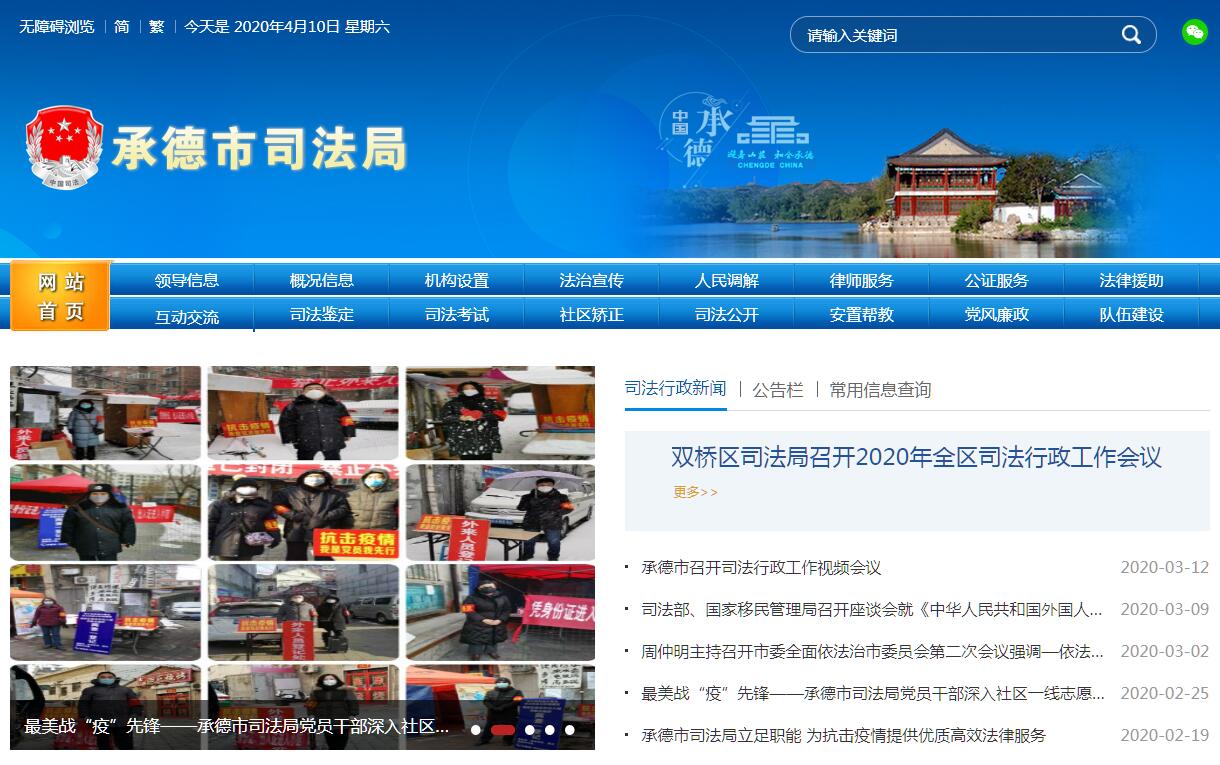 承德市司法局,负责承德市全市劳动教养管理工作并承担相应责任;负责全市违法行为教育矫治工作;负责指导、监督戒毒场所的管理工作;负责社区矫正工作。其主要职能是:(一)贯彻落实国家司法行政工作方针政策;拟订或参与拟订有关司法工作方面的地方性政策和管理办法,制定全市司法行政工作中长期规划并组织实施。(二)负责全市劳动教养管理工作并承担相应责任;负责全市违法行为教育矫治工作;负责指导、监督戒毒场所的管理工作;负责社区矫正工作。(三)拟订全市普及法律常识规划并组织实施;指导全市、各行业法制宣传、依法治理工作。(四)指导、监督全市律师工作、公证工作并承担相应责任;指导承德市律师协会、承德市公证员协会工作。(五)监督管理全市的法律援助工作;指导全市“12348”法律服务热线工作。(六)指导、监督基层司法所建设和人民调解、基层法律服和安置帮教工作;指导人民调解员协会工作。(七)负责组织实施全市国家司法考试工作。(八)主管全市司法鉴定人和司法鉴定机构的登记管理工作;指导承德市司法鉴定协会工作。(九)负责全市司法行政系统服装和警车等物资装备管理工作;指导、监督全市司法行政系统计划财务工作。(十)指导、监督全市司法行政系统领导班子建设和队伍建设;负责全市司法行政系统警务管理和警务督察工作;协助各县区管理司法局领导干部。(十一)负责机关和直属单位经济财务活动的内部审计监督。(十二)指导承德市法学会工作。(十三)承办市委、市政府交办的其他事项。
