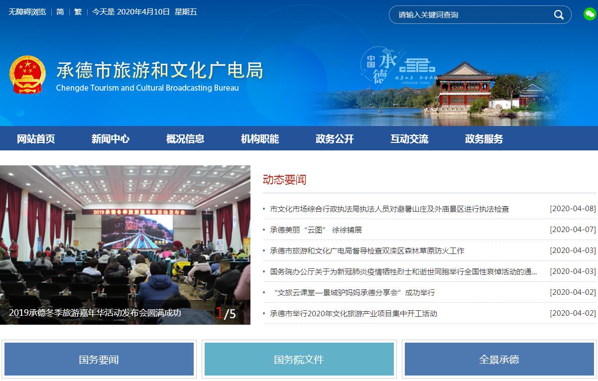 承德市旅游和文化广电局为市政府工作部门,机构规格正处级。承德市旅游和文化广电局贯彻落实党中央和省委。市委关于旅游、文化和广播电视工作的方针政策和决策部署,坚持和加强党对旅游、文化和广播电视工作的集中统一领导。其主要职责是:(一)贯彻执行党、国家和省旅游和文化工作方针政策和法律法规。研究拟订全市旅游和文化政策措施,起草全市旅游和文化政府规章草案;贯彻落实党的宣传、创作方针政策,加强广播电视阵地管理,把握正确的舆论导向和创作导向,起草全市广播电视和网络视听节目服务管理的政府规章草案。(二)拟订全市旅游、文化、广播电视事业和产业发展规划并组织实施。推进旅游和文化融合发展,推进旅游、文化、广播电视领域体制机制改革,指导全市旅游、文化、广播电视、网络视听行业人才队伍建设。(三)管理全市性重大旅游、文化、广播电视活动。指导和监管全市旅游、文化、广播电视重点基础设施建设,组织承德市旅游整体形象推广,促进旅游产业和文化产业对外合作和国际市场推广,制定全市旅游市场开发营销战略并组织实施,指导、推进全域旅游。(四)指导、管理全市文艺事业。指导艺术创作生产,扶持体现社会主义核心价值观、具有导向性代表性示范性的文艺作品,推动全市各门类艺术、各艺术品种发展。(五)负贵全市公共文化事业发展。推进全市公共文化服务体系、旅游公共服务体系、广播电视公共服务体系建设,深入实施文化惠民工程,统筹推进全市基本公共文化服务标准化、均等化。组织实施全市广播电视公共服务重大公益工程和公益活动,扶助边贫地区广播电视建设和发展。(六)指导、推进全市旅游和文化科技创新发展,推进旅游和文化行业信息化、标准化建设。(七)负责全市非物质文化遗产保护,推动非物质文化遗产的保护、传承、普及、弘扬和振兴。(八)统筹规划全市旅游、文化、广播电视产业。组织实施旅游和文化资源普査、挖掘、保护和利用工作,促进旅游、文化产业发展;负责旅游、文化产业、广播电视统计工作。(九)指导全市旅游、文化、广播电视市场发展。对旅游和文化市场经营进行行业监管,推进全市旅游和文化行业信用体系建设;对全市各类广播电视机构进行业务指导和行业监管,会同有关部门对全市网络视听节目服务机构进行管理,依法规范旅游、文化、广播电视市场。(十)指导全市电视剧行业发展和电视剧创作生产,监管全市广播电视节目、网络视听节目和公共视听载体播放的视听节目,审查其内容和质量,指导、监管全市广播电视广告播放。(十一)负责推进广播电视与新媒体新技术新业态融合发展,推进广播电视网与电信网、互联网三网融合,促进智慧广播电视发展。(十二)负责拟订全市广播电视科技发展规划、政策并组织实施和监督检查。对广播电视节目传输覆盖、监听、监看、监测的监管,推进全市应急广播体系建设,监管协调调度全市广播电视安全播出;承担全市广播电视安全播出指挥部日常工作,指导、协调全市广播电视系统安全和保卫工作。(十三)指导全市文化市场综合执法。组织查处全市性、跨区域文化、出版、广播电视、电影、旅游等市场的违法行为,督査督办大案要案,维护市场秩序。(十四)指导、管理全市旅游、文化、广播电视领域对外及港澳台交流、合作和宣传、推广工作。代表市政府签订对外旅游和文化合作协定,组织大型旅游和文化对外及港澳台交流活动,推动中华文化、承德特色文化、广播电视领域走出去工作。(十五)完成市委、市政府交办的其他任务。