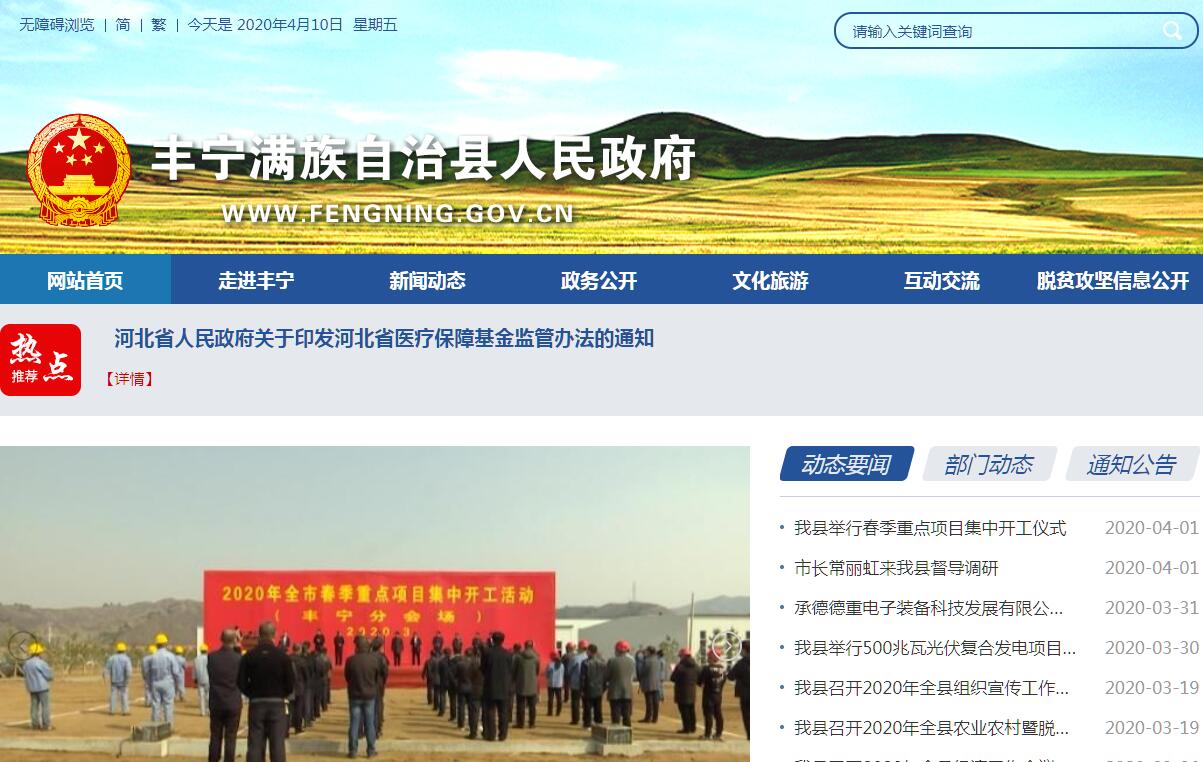 丰宁满族自治县位于河北省北部,南邻北京,北靠内蒙,地处燕山北麓和内蒙古高原南缘,是河北省6个坝上县、6个民族县、32个环京津县之一。辖10镇、16乡、1个街道办、1个省级开发 区,309个行政村,总人口41.1万人,有满族、回族、蒙古族等34个少数民族(共有29.4万人,占全县总人口的71.5%),其中满族人口26.7万人,占全县总人口的64.97%。2018年,全县地区生产总值增长7.3%;全部财政收入13.6亿元,同比增长12.4%,公共预算收入7.44亿元,同比增长21%;城镇和农村居民人均可支配收入23660元和8528元,分别增长9%和12%;开工亿元以上项目103个,完成投资143.7亿元。历史悠久,文化厚重。丰宁迄今3—5万年前就有人类活动,留下了红山文化、山戎文化等古人类遗址。清雍正13年(公元1735年)设四旗厅,乾隆43年(公元1778年)取“丰芜康宁”之意改设丰宁县。1987年经国务院批准撤销丰宁县,成立丰宁满族自治县。这里是当代著名诗人郭小川和全国一级战斗英雄郅顺义的故里。满蒙文化和民俗文化各具特色,滕氏布糊画获得中国民间文艺“山花奖”金奖;丰宁满族剪纸入选国家级和世界级非物质文化遗产名录。境内发现的古生物化石“华美金凤鸟”,被称为“天下第一鸟”,取代德国始祖鸟成为鸟类祖先,连同境内发现的其他恐龙化石,是21世纪演化生物学研究中最重要的科学发现之一。地域辽阔,资源丰富。总面积8765平方公里,分坝上、接坝、坝下三个地貌单元(坝上地区共有5个乡镇,面积为 2023平方公里;接坝地区共有4个乡镇,面积为1723平方公里;坝下地区共有17个乡镇,面积为4992平方公里)。是京津的生态屏障和重要水源地,供北京市、天津市饮用水的潮河、滦河均发源于丰宁。负氧离子丰富,为京北“天然氧吧”, 二级以上天数286天。有耕地139万亩、林地713万亩、草场138万亩,森林覆盖率达到57.5%;探明矿产资源30多种,其中钼矿资源储量居全国前列。区位优越,风光秀美。与北京市怀柔区接壤,县城距怀柔区界仅18公里,至北京市区只有2个多小时车程。境内有2条铁路(张唐、虎蓝铁路,境内全长247公里)、1条高速公路(张承高速,境内全长138公里)、10条国省干线公路(境内全长715公里)、5条县级路(全长444公里)。依托京北第一草原、千松坝森林公园、燕山大峡谷、九龙松、白云古洞、洪汤寺温泉等得天独厚旅游资源,着力打造京北生态旅游和健康养老福地;全县建成4A级景区2处,3A级景区1处,2A级景区3处,国家级森林公园、国家级湿地公园和人造主题公园各1处;先后荣获河北魅力景区、河北旅游强县、京北最佳旅游目的地等称号。