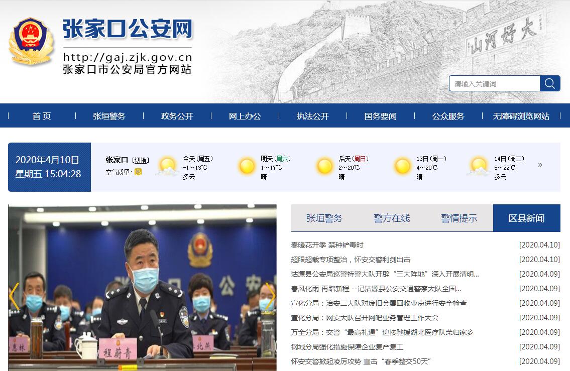 张家口市公安局工作职能:(一)贯彻执行党和国家有关公安工作的方针、政策、法律、法规和市委、市政府、公安厅的指示;拟订、研究落实有关政策和实施意见;部署、指导、监督、检查全市公安工作。(二)掌握影响社会稳定、危害国内安全和社会治安的情况,分析形势,研究提出对策措施;组织、指导110接处警和公安信息工作(三)主管和指导经济、刑事犯罪等侦查工作;组织、协调重大案件和涉外、跨地区重大案件以及上级交办案件的侦查工作。(四)指导、监督全市公安机关依法查处危害社会治安秩序行为,依法管理特种行业和内河水域,组织、协调对重特大治安事件和突发性事件的处置工作,管理集会、游行、示威活动;组织、指挥公安特警队的处突防暴工作。(五)负责中国公民出入境和外国人在中国境内居留、旅行的有关工作。(六)负责本市行政区域内的消防监督管理工作;领导公安消防队承担灾害事故和其他以抢救人员生命为主的应急救援工作。(七)指导、监督全市公安机关维护道路交通安全、交通秩序以及机动车辆、驾驶员管理工作;负责市区道路交通管理工作。(八)指导全市公安机关对国家机关、社会团体、企事业单位和重点工程的治安保卫工作以及群众性治安保卫组织的治安防范工作;负责全市武装守护押运的管理工作;负责全市保安服务活动的监督管理工作。(九)按照规定权限,组织、指导计算机信息系统及互联网安全保护管理工作;组织、指导网络犯罪侦查。(十)指导、监督全市看守所、拘留所、收容教育所、安康医院和公安机关管理的强制隔离戒毒所的工作。(十一)规划、指导全市公安法制工作;指导、监督全市公安机关执法活动;负责指导、监督收容教养审批工作及公安机关承办当地政府劳动教养委员会的日常工作;承担行政复议、应诉、国家赔偿等案件的办理工作。(十二)组织实施对来绍的党和国家领导人、重要外宾以及重大活动、重要会议的安全警卫工作。(十三)组织、协调、指导全市禁毒、缉毒工作。(十四)组织、指导全市公安科学技术和信息化工作;负责全市公安机关信息通信勤务保障工作的规划协调和组织指导;负责全市社会公共安全技术防范的行业管理。(十五)指导、管理全市公安机关装备、被装、经费和基本建设等警务保障工作。(十六)领导全市公安消防部队建设;按规定权限,对武警部队执行公安任务实施领导和指挥。(十七)指导全市公安队伍建设,协管县级公安机关领导干部;负责全市公安机关及其人民警察的表彰奖励、评优创模和人民警察内务条令的贯彻实施工作;制定全市公安教育训练发展规划,组织指导公安民警学历教育、在职训练、警察体育工作;组织、协调、指导全市公安机关对外宣传工作。(十八)按规定权限实施对公安机关及人民警察的监督;领导全市公安机关督察工作,组织、指导维护民警执法权益工作;查处或督办公安队伍违纪案件;组织、指导全市公安内部审计工作。(十九)指导森林公安机构的业务工作。(二十)承办市政府交办的其他事项。