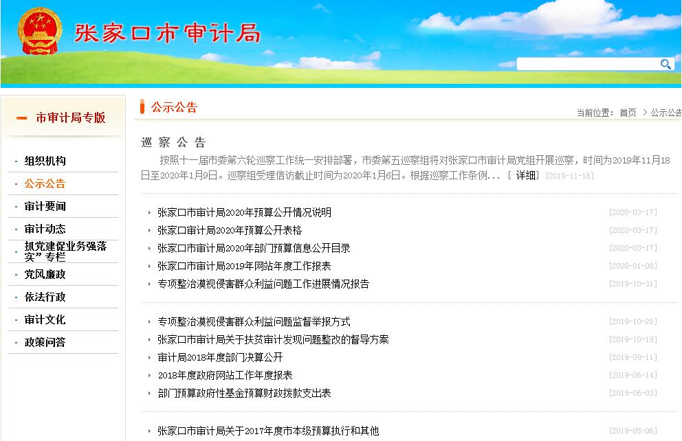 张家口市审计局主要职责是:(一)主管全市审计工作。负责对全市财政收支和依法属于审计监督范围的财务收支的真实、合法和效益进行审计监督,对公共资金、公共投资项目、国有资产、国有资源和领导干部履行经济责任情况实行审计全覆盖,对领导干部实行自然资源资产离任审计,对国家和省委、省政府以及市委、市政府相关重大政策措施贯彻落实情况进行跟踪审计。对审计、专项审计调查和核查社会审计机构相关审计报告的结果承担责任,并负有督促被审计单位整改的责任。(二)贯彻执行审计法律、法规和方针、政策。组织落实审计地方性法规、政府规章;制定审计规范性文件并监督执行;制定并组织实施全市审计工作发展规划和专业领域审计工作规划;制定并组织实施全市年度审计计划,审批、调整下级审计机关年度审计项目计划;制定审计内容的标准和规范;参与起草财政经济及其相关的地方性法规、政府规章草案;对直接审计、调查和核查的事项依法进行审计评价,做出审计决定或提出审计建议。(三)向中共张家口市委审计委员会提出年度市本级预算执行和其他财政收支情况审计报告。向市长提出年度市本级预算执行和其他财政收支情况的审计结果报告。组织起草市政府向市人大常委会提出市本级预算执行和其他财政收支情况的审计工作报告、审计查出问题整改情况报告。向市委、市政府报告对其他事项的审计和专项审计调查情况及结果。依法向社会公布审计结果。向被审计单位通报审计情况和审计结果。(四)直接审计下列事项,出具审计报告,在法定职权范围内做出审计决定,包括国家和省、市有关重大政策措施贯彻落实情况;市本级预算执行情况和其他财政收支,市直各部门(含所属单位)预算执行情况、决算草案和其他财政收支;县级政府预算执行情况、决算草案和其他财政收支,市级财政转移支付资金;使用市级财政资金的事业单位和社会团体的财务收支;市投资和以市投资为主的建设项目的预算执行情况和决算,市重大公共工程项目的资金管理使用和建设运营情况;自然资源管理、污染防治和生态保护与修复情况;市属国有和国有资本占控股或者主导地位的企业和金融机构境内外资产、负债和损益,市驻外非经营性机构的财务收支;有关社会保障基金、社会捐赠资金和其他基金、资金的财务收支;国际组织和外国政府援助、贷款项目;法律法规规定的其他事项。(五)按规定对市管党政主要领导干部及其他单位主要负责人实施经济责任审计和自然资源资产离任审计。(六)组织实施对财经法律法规、规章、政策和宏观调控措施执行情况、财政预算管理及国有资产管理使用等与财政收支有关的特定事项进行专项审计调查。负责市级预算执行情况和其他财政收支情况的监督检查。负责重大项目稽察。负责国有企业领导干部经济责任审计。承担国有企业监事会职责。(七)依法检查审计决定执行情况,督促整改审计查出的问题,依法办理被审计单位对审计决定提请行政复议、行政诉讼或市政府裁决中的有关事项,协助配合有关部门查处相关重大案件。(八)指导和监督内部审计工作,核查社会审计机构对依法属于审计监督对象的单位出具的相关审计报告。(九)与县(区)委、县(区)政府共同领导县(区)审计机关。依法领导和监督下级审计机关的业务,组织下级审计机关实施特定项目的专项审计或审计调查,纠正或责成纠正下级审计机关违反国家规定做出的审计决定。按照干部管理权限协管县(区)审计机关负责人。(十)组织开展审计领域的交流与合作,指导和推广信息技术在审计领域的应用。负责审计业务数据管理。(十一)完成市委、市政府和省审计厅交办的其他任务。