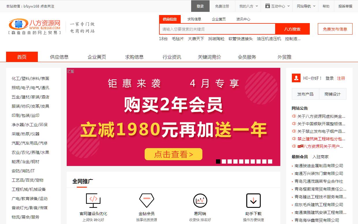 | 网站简介: 八方资源网(深圳市八方通科技开发有限公司旗下网站),是一家一站式企业服务平台,提供B2B行业海量的行业资讯、供应信息、求购信息和公司黄页信息等.致力于为中小企业提供域名空间、网站建设、商机发布、网络营销、搜索引擎优化等一站式电子商务解决方案。至今为止平台拥有企业注册会员上千万,访问量超过千万,覆盖2800多个城市、300多个行业,影响商务人群超过1.2亿。至今八方资源网成为了行业领先平台,客户受欢迎平台之一。八方资源网将努力突破目前中国电子商务行业普遍存在的访问量大、成交量小、交易成本高、效率低下、用户体验差等瓶颈,倾力打造中小企业信赖的、效率高的、人性化的智能电子商务平台。 |