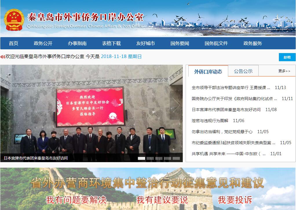 2018年12月25日,根据秦皇岛市机构改革统一部署,秦皇岛市外办裁撤并入秦皇岛市商务局,组建秦皇岛市外事和商务局。原秦皇岛外办办公地址:秦皇岛市海港区朝阳街100号变更为秦皇岛市海港区友谊路78号。秦皇岛市外事侨务口岸办公室主要职责:口岸工作职责:组织编制和实施全省口岸发展规划和年度计划,指导、管理和协调全省口岸工作;负责全省口岸开放关闭、机构设立、编制调整、专项资金的审查报批及口岸查验设施规划、建设;负责组织协调口岸通关中各有关部门的工作关系;对口岸现场检查检验部门依法履行职责的情况进行监督检查;组织协调开辟国际航线、客货源及开拓口岸腹地工作;指导协调全省口岸系统共建文明口岸工作。侨务工作职责:(一)贯彻执行党和国家有关侨务工作的方针、政策和法律、法规,研究拟定侨务工作的实施细则、配套政策和地方性规定,制订本市侨务工作规划。(二)调查研究国内外侨情和本市侨务工作情况,研究引进华侨、华人、港澳同胞资金、技术、人才工作并向有关部门提供信息和提出建议;负责统筹、协调涉侨部门和社会团体开展华侨、华人,港澳同胞工作。(三)负责开展对华侨、华人、港澳同胞的宣传、文化交流和华文教育工作;协助有关部门对本市涉侨宣传报道进行审核。(四)依法保护归侨、侨眷、华侨、华人和港澳同胞在津的合法权益;会同有关部门开展为在津侨资企业和华侨、华人的服务工作;负责对移民海外的新华侨代表人士的工作;协助有关部门做好归侨、侨眷代表人士的人事安排工作;会同有关部门做好贫困归侨、侨眷的服务工作;负责侨务信访工作。(五)参与制订华侨、归侨、侨眷出入境的有关政策;会同公安部门依法审批管理华侨和港澳同胞回津定居事项。(六)负责华侨、华人、港澳同胞对本市捐赠的办理工作,并对受赠单位使用捐赠的情况进行监督检查。(七)负责组织本市以侨务为主要任务的出访工作;统筹、协调有关侨务接待工作;配合我驻外使领馆和有关机构,开展对华侨、华人和港澳同胞及其社团的团结友好工作。(八)在中央对台工作的方针指导下,通过本市侨务渠道开展对台工作。(九)承办市委、市政府交办的其他事项。外事工作职责:(一)贯彻执行党和国家的对外方针、政策和涉外法规以及关于外事工作的指示和决定,检查本市各部门、各单位贯彻执行情况;起草本市外事工作规范性文件,研究拟订本市外事工作规划和制度,并组织实施;组织开展外事工作重大问题的调查研究,为市委、市政府的对外工作决策提供意见和建议。(二)贯彻执行中央对香港、澳门的政策规定,推动本市与香港、澳门在经济、科技、文化等领域的交流与合作。(三)负责本市与外国相关区市政府间的交流,办理市属单位对外缔结友好交流合作关系事项,管理与国际友好城市的交往活动;配合市有关部门接待来本区访问的重要外宾;统筹安排市领导的外事活动和出访事宜。(四)负责审核、申报本区因公出国(境)任务和邀请外国人来访工作;为因公出国(境)人员申办护照(通行证)、签证及办理其他有关证件,监督管理因公护照、通行证的收缴、保管工作;负责为本市商务人员审核、申办亚太经济合作组织(简称“亚太经合组织”——APEC)商务旅行卡;承办各单位报请市委、市政府审批的外事文件。(五)负责牵头协调涉外管理和服务;配合市政府做好有关境外领事保护工作。(六)负责外国记者及港澳记者在本市采访的有关事宜。(七)组织协调推进本市国际语言环境建设工作。(八)负责对本市外事干部和涉外人员进行对外政策和外事纪律的教育;会同有关部门检查外事纪律的执行情况,并对违反外事纪律问题提出处理意见和建议。(九)负责市外事工作领导小组办公室相关工作。(十)承办市委、市政府交办的其它事项。