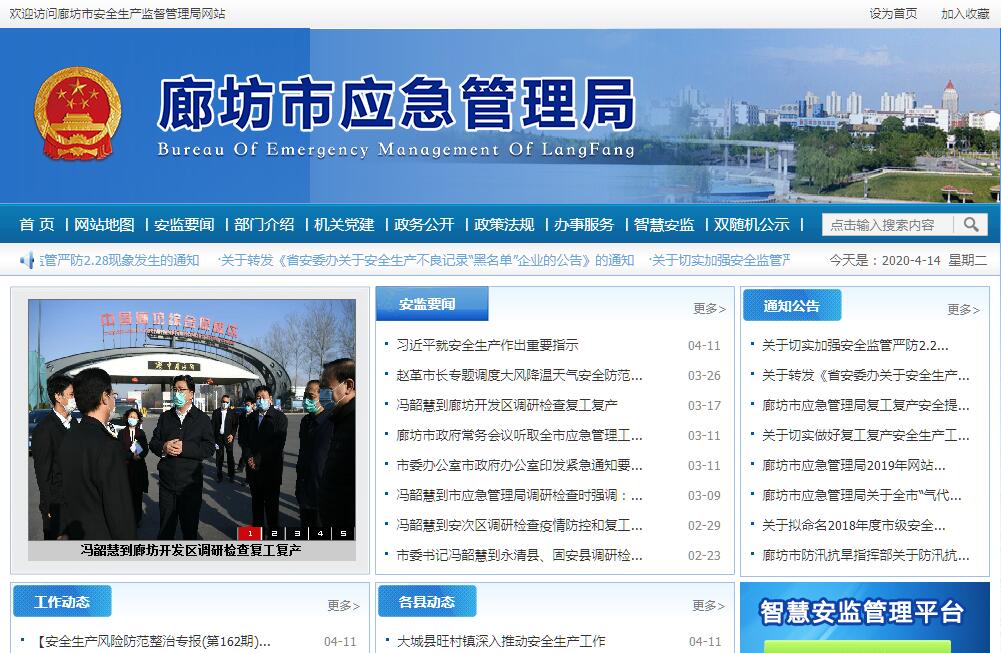 廊坊市应急管理局主要职责:(一)负责应急管理工作,指导各级各部门应对安全生产类、自然灾害类等突发事件和综合防灾减灾救灾工作。负责安全生产综合监督管理和工矿商贸行业安全生产监督管理工作。(二)拟订应急管理、安全生产等政策规定,组织编制市应急体系建设、安全生产和综合防灾减灾规划,组织编制防震减灾规划、计划,组织制定相关规程和标准并监督实施。(三)指导应急预案体系建设,建立完善事故灾难和自然灾害分级应对制度,组织编制市总体应急预案和安全生产类、自然灾害类专项预案,综合协调应急预案衔接工作,组织开展预案演练,推动应急避难设施建设。(四)牵头建立统一的全市应急管理信息系统,负责信息传输渠道的规划和布局,建立监测预警和灾情报告制度,健全自然灾害信息资源获取和共享机制,依法统一发布灾情。(五)组织指导协调安全生产类、自然灾害类等突发事件应急救援,承担市应对重大灾害指挥部工作,综合研判突发事件发展态势并提出应对建议,协助市委、市政府指定的负责同志组织重大灾害应急处置工作。(六)统一协调指挥各类应急专业队伍,建立应急协调联动机制,推进指挥平台对接,衔接解放军和武警部队参与应急救援工作。(七)统筹应急救援力量建设,负责消防、森林和草原火灾扑救、抗洪抢险、地震和地质灾害救援、生产安全事故救援等专业应急救援力量建设,管理市综合性应急救援队伍,指导各级及社会应急救援力量建设。(八)组织协调消防工作,指导各级消防监督、火灾预防、火灾扑救等工作。(九)指导协调森林和草原火灾、水旱灾害、地质灾害等防治工作,组织开展地震监测预报工作和地震灾害预防工作,负责自然灾害综合监测预警工作,指导开展自然灾害综合风险评估工作。(十)组织协调灾害救助工作,组织指导灾情核查、损失评估、救灾捐赠工作,管理、分配市救灾款物并监督使用。(十一)依法行使市安全生产综合监督管理职权,指导协调、监督检查市有关部门和各县(市、区)政府、廊坊开发区管委会安全生产工作,组织开展安全生产巡查、考核工作。(十二)按照分级、属地原则,依法监督检查工矿商贸生产经营单位贯彻执行安全生产法律法规情况,及其安全生产条件和有关设备(特种设备除外)、材料、劳动防护用品的安全生产管理工作;负责监督管理工矿商贸行业市属企业的安全生产工作;按照有关要求,负责监督管理驻廊中央、省属企业的安全生产工作;依法组织并指导监督实施安全生产准入制度;负责危险化学品安全监督管理综合工作和烟花爆竹安全生产监督管理工作。(十三)依法组织指导生产安全事故调查处理,监督事故查处和责任追究落实情况。组织开展自然灾害类突发事件的调查评估工作。(十四)制定应急物资储备和应急救援装备规划并组织实施,会同市粮食和物资储备等部门建立健全应急物资信息平台和调拨制度,在救灾时统一调度。(十五)负责应急管理、安全生产宣传教育和培训工作,组织指导应急管理、安全生产的科学技术研究、推广应用和信息化建设工作。(十六)负责组织指导协调和监督全市安全生产行政执法工作,组织开展对市属企业和驻廊中央、省属企业的执法检查,组织开展对安全生产重点企业的执法检查,负责全市抗震设防执法工作。(十七)组织开展应急管理方面的对外交流与合作。(十八)完成市委、市政府交办的其他任务。
