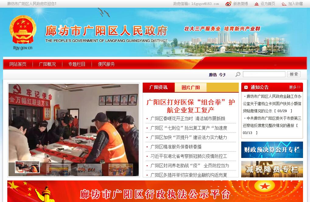 广阳区,隶属于河北省廊坊市,是廊坊市中心城区之一,是廊坊市的政治、经济和文化中心,中国共产党廊坊市委员会、廊坊市人民政府所在地, 地处河北省中北部,廊坊市区北部,下辖5个街道、3个镇、1个经济技术开发区和1个管委会,总面积361.89平方公里,总人口41万人(2013年)。广阳境域周代属燕国地,西汉置 安次县,1989年成立地级廊坊市并设安次区, 2000年划出安次区京沪铁路以北部分及九州、万庄等乡镇,成立广阳区。广阳有炊庄高腔戏、冀中笙管乐、李派太极拳等非物质文化遗产,境内有大枣林庄古槐、北旺村遗址等文物古迹。广阳区位于华北平原北部,属暖温带半干旱季风气候,永定河、龙河、凤河、新旧天堂河流经境内。粮食主产小麦、玉米,工业门类有机械制造、建材、电子电器、食品、调料、服装、玻璃制品、印刷、化工等,廊坊经济技术开发区位于区内。2017年,广阳区地区生产总值301.5亿元,同比增长10.7%;固定资产投资264.6亿元,同比增长22%;规模以上工业增加值30.1亿元,同比增长7%;社会消费品零售总额191.2亿元,同比增长11.9%;城镇居民人均可支配收入37654元,同比增长8.4%;农村居民人均可支配收入14850元,同比增长8.5%。全部财政收入73.96亿元,同比增长29.9%;一般公共预算收入18.19亿元,同比增长7.1%。三次产业结构优化为3.9:24.5:71.6。2018年12月,广阳区被民政部确认第三批全国社区治理和服务创新实验区。