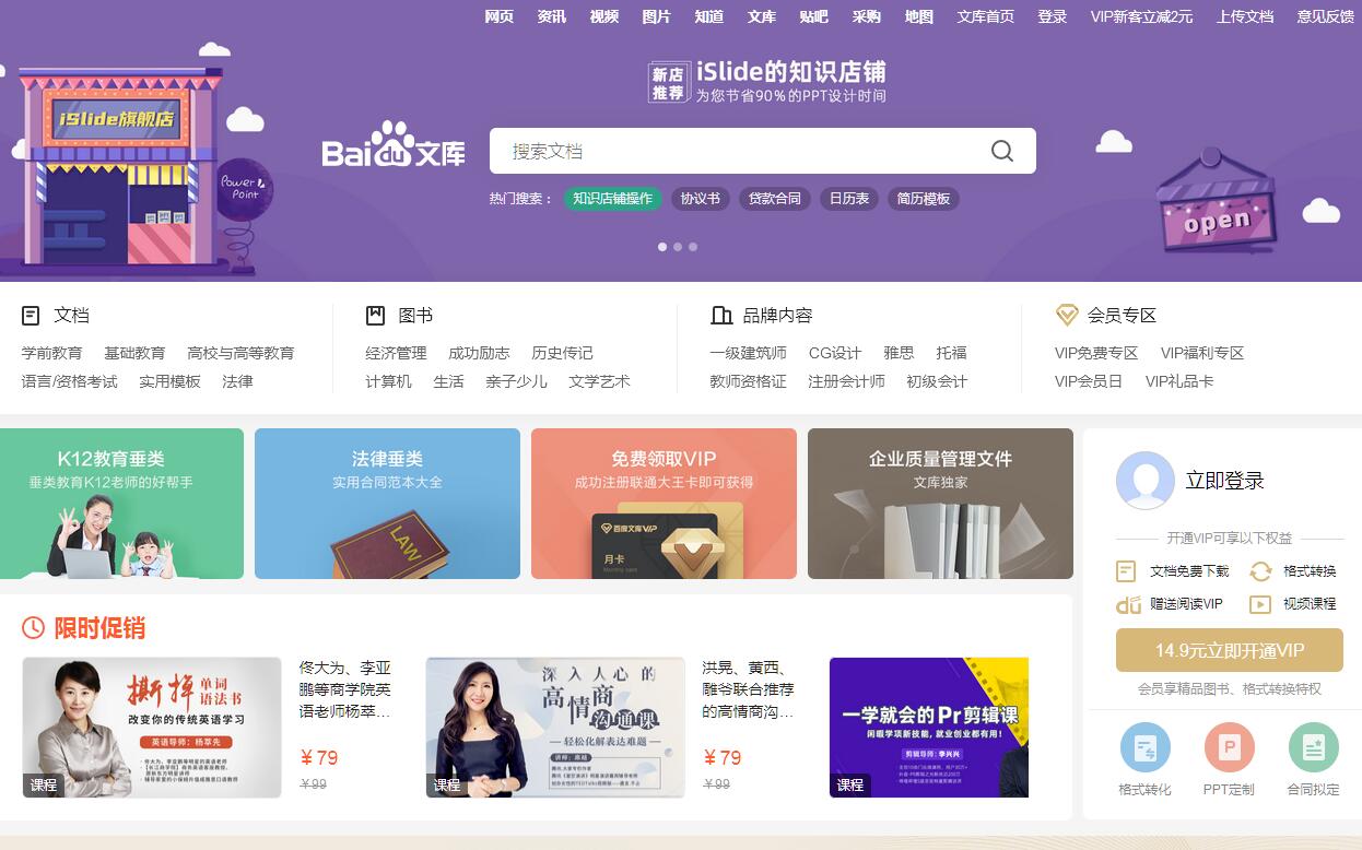 百度文库——让每个人平等地提升自我。在线互动式文档分享平台,在这里,您可以和千万网友分享自己手中的文档,全文阅读其他用户的文档,同时,也可以利用分享文档获取的积分下载文档。百度文库是百度发布的供网友在线分享文档的平台。百度文库的文档由百度用户上传,需要经过百度的审核才能发布,百度自身不编辑或修改用户上传的文档内容。网友可以在线阅读和下载这些文档。百度文库的文档包括教学资料、考试题库、专业资料、公文写作、法律文件等多个领域的资料。百度用户上传文档可以得到一定的积分,下载有标价的文档则需要消耗积分。当前平台支持主流的doc(.docx)、.ppt(.pptx)、.xls(.xlsx)、.pot、.pps、.vsd、.rtf、.wps、.et、.dps、.pdf、.txt文件格式。百度文库平台于2009年11月12日推出,2010年7月8日,百度文库手机版上线。2010年11月10日,百度文库文档数量突破1000万。2011年12月文库优化改版,内容专注于教育、PPT、专业文献、应用文书四大领域。2013年11月正式推出文库个人认证项目。截至2014年4月文库文档数量已突破一亿。2015年12月发布基础教育战略,并推出其首套《大数据透视高考》系列专题书。