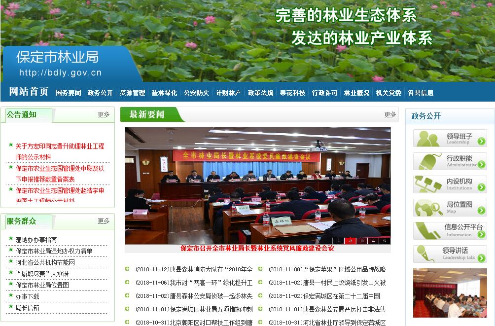 保定市林业局主要职责是:一、负责全市林业及其生态建设的监督管理。贯彻执行国家、省关于林业及其生态建设的方针政策和法律法规;拟订全市林业及其生态环境建设、森林资源保护、国土绿化、荒漠化防治和林业产业发展的政府规章草案和政策,经批准后组织实施并监督检查。拟订全市林业及其生态建设发展战略、中长期规划、年度计划、综合规划和有关专业规划并组织实施。组织开展森林资源、陆生野生动植物资源、湿地和荒漠的调查、动态监测和评估,并统一发布相关信息。承担林业生态文明建设的有关工作。二、组织、协调、指导和监督全市造林绿化工作。制定全市造林绿化的指导性计划,贯彻落实国家、省有关标准和规程,指导公益林和商品林的培育,指导植树造林、封山育林和以植树种草等生物措施防治、水土流失工作,指导监督全民义务植树和造林绿化工作。承担林业应对气候变化的相关工作。承担保定市绿化委员会的具体工作。三、承担全市森林资源保护发展监督管理的责任。组织编制森林采伐限额,报上级批准后监督实施;监督检查林木凭证采伐、运输,组织指导林地、林权管理,组织实施林权登记、发证工作。拟订林地保护利用规划并指导实施,依法承担应由市政府批准的林地征用、占用的初审工作。四、组织、协调、指导和监督全市湿地保护工作。拟订全市湿地保护规划,组织实施建立湿地保护区、湿地公园等保护管理工作,监督湿地的合理利用。五、组织、协调、指导和监督全市荒漠化防治工作。组织拟订全市防沙治沙、荒漠化防治及沙化土地封禁保护区建设规划,监督沙化土地的合理利用,组织指导建设项目对土地沙化影响的审核,组织指导沙尘暴灾害预测预报和应急处置。六、组织指导全市陆生野生动植物资源的保护和合理开发利用。拟订及调整市重点保护的陆生野生动物、植物名录,报市政府批准后发布并监督实施,依法组织指导陆生野生动植物的救护繁育、栖息地恢复发展、疫源疫病监测,监督管理全市陆生野生动植物猎捕或采集、驯养繁殖或培植、经营利用,监督管理野生动植物进出口。承担濒危物种进出口和国家、省、市保护的野生动物、珍稀树种、珍稀野生植物及其产品出口的审核工作。七、负责全市林业系统自然保护区的监督管理。在国家和省自然保护区区划、规划原则的指导下,依法指导森林、湿地、荒漠化和陆生野生动物类型自然保护区的建设和管理,监督管理林业生物种质资源、转基因生物安全、植物新品种和生物多样性保护。八、承担推进全市林业改革,维护农民经营林业合法权益的责任。拟订集体林权制度、国有林场等重大林业改革意见并指导监督实施。拟订农村林业发展、维护农民经营林业合法权益的措施,指导监督农村林地承包经营和林权流转,指导林权纠纷调处和林地承包合同纠纷仲裁。依法负责退耕还林工作。指导国有林场(苗圃)、森林公园和基层林业工作队伍的建设和管理。九、指导监督全市各产业对森林、湿地、荒漠和陆生野生动植物资源的开发利用。指导全市林业产业工作,落实林业资源优化配置政策,组织指导林产品质量监督。指导赴境外森林资源开发的有关工作。指导山区综合开发。十、承担组织、协调、指导、监督全市森林防火工作的责任。组织、协调、指导森林火灾的预防与扑救工作,承担保定市森林防火指挥部的具体工作。承担林业综合行政执法监管的责任。指导全市森林公安工作,监督管理森林公安队伍,指导全市林业重大违法案件的查处。指导林业有害生物的防治、检疫工作。十一、负责全市果品、蚕桑、花卉行业的管理工作。监督实施果品、蚕桑、花卉的结构调整和基地建设,组织指导果品、蚕桑、花卉的品种改良、品质提高和标准化生产工作。监督管理果品质量安全,负责果品质量安全监测及信息发布工作。十二、落实林业及其生态建设的经济调节政策,组织指导林业及其生态建设的生态补偿制度的建立和实施。编制部门预算并组织实施,监管国有林业资产和森林资源资产,管理市级林业资金,指导监督全市林业资金的管理和使用。按照规定权限,审核申报或审批核准规划内和年度计划内重点林业建设项目并监督实施。十三、组织指导全市林业及其生态建设的科技、教育和外事工作。指导全市林业队伍建设。十四、承办市政府交办的其他事项。