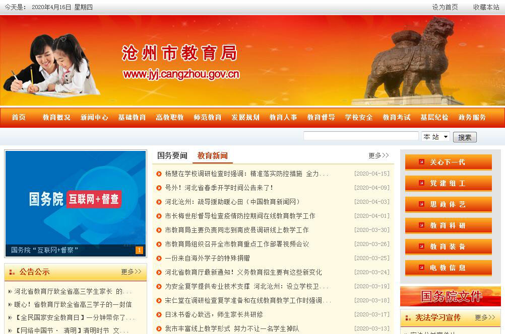 沧州市教育局,为市政府工作部门。其主要职责是:(一)负责教育系统党的政治建设、思想建设、组织建设、作风建设、纪律建设和制度建设。(二)承担所属高校基层党组织和党员队伍建设工作。(三)指导所属高校意识形态和党的宣传教育工作,指导和督促党的统一战线方针政策在高校的贯彻落实。(四)按照干部管理权限,协助市委做好所属处级学校领导班子及市管干部的管理工作。指导所属高校干部队伍建设工作。做好所属科级学校领导班子及其成员的管理工作和干部队伍建设工作。(五)负责全市各级各类学校学生和教师的思想政治工作,指导全市学校思想政治工作队伍建设,指导所属高校思想政治理论课程和中小学德育课程教育教学。(六)统筹管理全市教育系统人才工作。(七)负责教育系统安全稳定和校园及周边综合治理工作,指导全市各级各类学校的安全监督管理工作。(八)拟订全市教育改革与发展的政策和规划,起草有关教育的规范性文件并组织实施。(九)负责全市各级各类教育的统筹规划和协调管理,会同有关部门组织落实全市各级各类学校的设置标准,指导全市各级各类学校的教育教学改革,负责教育基本信息的统计、分析和发布。(十)负责基础教育管理工作,指导基础教育改革与发展。负责义务教育的协调指导和组织实施,推进义务教育均衡发展,促进教育公平。组织指导普通高中教育、幼儿教育和特殊教育。研究制定基础教育教学政策,推进素质教育。(十一)会同有关部门组织指导职业教育发展与改革,拟订中等职业教育教学指导政策和教学评估标准,负责中等职业教育的地方教材建设和职业指导工作。负责成人教育和社区教育的指导工作。(十二)指导高等教育发展与改革,深化高校管理体制改革,落实高等教育教学指导政策。指导各类高等教育和继续教育工作。(十三)会同有关部门审核全市各级各类学校的设置、更名、撤销与调整。(十四)拟订中等职业学校和中小学、幼儿园招生计划。负责中等学历教育、中小学和幼儿园教育的学籍学历管理。负责毕业生离校前的就业创业指导和服务工作,参与拟订师范类毕业生就业创业政策并组织实施。(十五)规划、指导所属高校科学研究工作,协调指导所属高校参与国家、省、市创新体系建设和承担国家、省、市各类科研项目,指导所属高校科技创新平台建设工作和科研成果管理及产学研结合等工作。组织指导教育信息化工作。(十六)统筹指导少数民族教育工作,协调对少数民族和少数民族地区的教育援助。(十七)指导全市各级各类学校的德育、体育、卫生与艺术教育、劳动教育和国防教育工作。(十八)负责全市教师工作。贯彻落实中小学、幼儿园和中等职业教师资格标准。负责全市教师教育工作,规划、指导教育系统人才队伍建设。会同有关部门组织实施教育系统职称评聘、表彰奖励等工作。(十九)负责本系统教育经费的统筹管理和内部审计,参与拟订教育经费筹措、教育拨款、教育基建投资等政策,负责全市教育经费投入统计工作。(二十)负责全市语言文字工作的规划指导、统筹协调和监督管理。承担沧州市语言文字工作委员会交办的其他事项。(二十一)负责全市教育督导工作,拟订全市教育督导的规章制度和标准,组织实施对县级政府履行教育职责评价,组织开展全市各级各类教育的督导评估、检查验收、质量监测等工作,承担沧州市人民政府教育督导委员会交办的其他事项。(二十二)指导全市老年教育工作。(二十三)组织指导全市教育国际交流合作工作。(二十四)承办市委、市政府交办的其他工作事项。