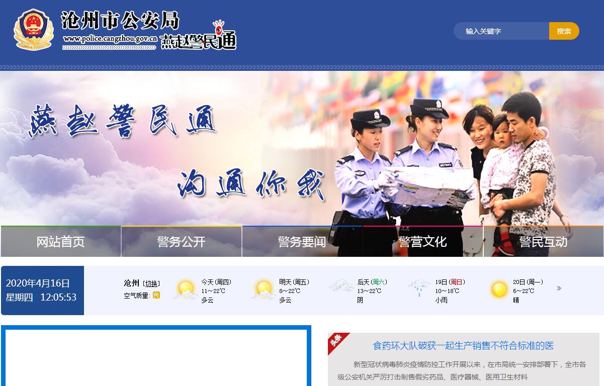 沧州市公安局是沧州市人民政府组成机构,属于沧州市人民政府组成机构主管,河北省公安厅指导管理的公安机关。其主要职责是:(一)贯彻执行党和国家有关公安工作的方针、政策、法律、法规和市委、市政府、公安厅的指示;拟订、研究落实有关政策和实施意见;部署、指导、监督、检查全市公安工作。(二)掌握影响社会稳定、危害国内安全和社会治安的情况,分析形势,研究提出对策措施;组织、指导110接处警和公安信息工作。(三)主管和指导经济、刑事犯罪等侦查工作;组织、协调重大案件和涉外、跨地区重大案件以及上级交办案件的侦查工作。(四)指导、监督全市公安机关依法查处危害社会治安秩序行为,依法管理特种行业和内河水域,组织、协调对重特大治安事件和突发性事件的处置工作,管理集会、游行、示威活动;组织、指挥公安特警队的处突防暴工作。(五)负责中国公民出入境和外国人在中国境内居留、旅行的有关工作。(六)负责本市行政区域内的消防监督管理工作;领导公安消防队承担灾害事故和其他以抢救人员生命为主的应急救援工作。(七)指导、监督全市公安机关维护道路交通安全、交通秩序以及机动车辆、驾驶员管理工作;负责市区道路交通管理工作。(八)指导全市公安机关对国家机关、社会团体、企事业单位和重点工程的治安保卫工作以及群众性治安保卫组织的治安防范工作;负责全市武装守护押运的管理工作;负责全市保安服务活动的监督管理工作。(九)按照规定权限,组织、指导计算机信息系统及互联网安全保护管理工作;组织、指导网络犯罪侦查。(十)指导、监督全市看守所、拘留所、收容教育所、安康医院和公安机关管理的强制隔离戒毒所的工作。(十一)规划、指导全市公安法制工作;指导、监督全市公安机关执法活动;负责指导、监督收容教养审批工作及公安机关承办当地政府劳动教养委员会的日常工作;承担行政复议、应诉、国家赔偿等案件的办理工作。(十二)组织实施对来绍的党和国家领导人、重要外宾以及重大活动、重要会议的安全警卫工作。(十三)组织、协调、指导全市禁毒、缉毒工作。(十四)组织、指导全市公安科学技术和信息化工作;负责全市公安机关信息通信勤务保障工作的规划协调和组织指导;负责全市社会公共安全技术防范的行业管理。(十五)指导、管理全市公安机关装备、被装、经费和基本建设等警务保障工作。(十六)领导全市公安消防部队建设;按规定权限,对武警部队执行公安任务实施领导和指挥。(十七)指导全市公安队伍建设,协管县级公安机关领导干部;负责全市公安机关及其人民警察的表彰奖励、评优创模和人民警察内务条令的贯彻实施工作;制定全市公安教育训练发展规划,组织指导公安民警学历教育、在职训练、警察体育工作;组织、协调、指导全市公安机关对外宣传工作。(十八)按规定权限实施对公安机关及人民警察的监督;领导全市公安机关督察工作,组织、指导维护民警执法权益工作;查处或督办公安队伍违纪案件;组织、指导全市公安内部审计工作。(十九)指导森林公安机构的业务工作。(二十)承办市政府交办的其他事项。