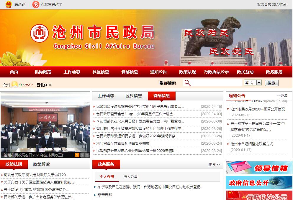 沧州市民政局主要职责:(一)贯彻执行民政事业发展法律法规、政策、规划,拟订全市民政事业发展政策、规划等规范性文件并组织实施。(二)拟订全市社会团体、基金会、社会服务机构等社会组织监督管理办法并组织实施,依法对全市社会组织进行管理和监督检查。承担市社会组织党委日常工作。(三)拟订全市社会救助政策、标准,统筹社会救助体系建设。负责城乡居民最低生活保障、特困人员救助供养、临时救助、生活无着流浪乞讨人员救助工作。(四)拟订全市基层群众自治和城乡社区治理政策。指导城乡社区治理体系和能力建设,提出加强和改进基层政权建设的建议,推动基层民主政治建设。(五)拟订全市行政区划、行政区域界线管理和地名管理政策、标准和办法。负责县(市、区)行政区域及乡镇、街道办事处的设立、命名、变更和政府驻地迁移的调查论证、管理工作;负责全市地名管理工作;组织、指导县级行政区域界线的勘定和管理工作;负责重要自然地理实体命名、更名的管理工作。(六)拟订全市婚姻管理政策并组织实施,推进婚俗改革,指导婚姻服务机构管理工作。(七)拟订全市殡葬管理政策、服务规范并组织实施,推进殡葬改革,指导殡葬服务机构管理工作。(八)统筹推进、督促指导、监督管理全市养老服务工作。拟订全市养老服务体系建设规划、政策、标准并组织实施,承担老年人福利和特殊困难老年人救助工作。(九)拟订全市残疾人权益保护政策并组织实施。统筹推进残疾人福利制度建设和康复辅助器具产业发展。(十)拟订全市儿童福利、孤弃儿童保障、儿童收养、儿童救助保护政策、标准。健全农村留守儿童关爱服务体系和困境儿童保障制度。(十一)组织拟订促进全市慈善事业发展政策,指导社会捐助工作,负责福利管理工作。(十二)拟订全市社会工作、志愿服务政策和标准,会同有关部门推进社会工作人才队伍建设和志愿者队伍建设。(十三)完成市委、市政府交办的其他任务。