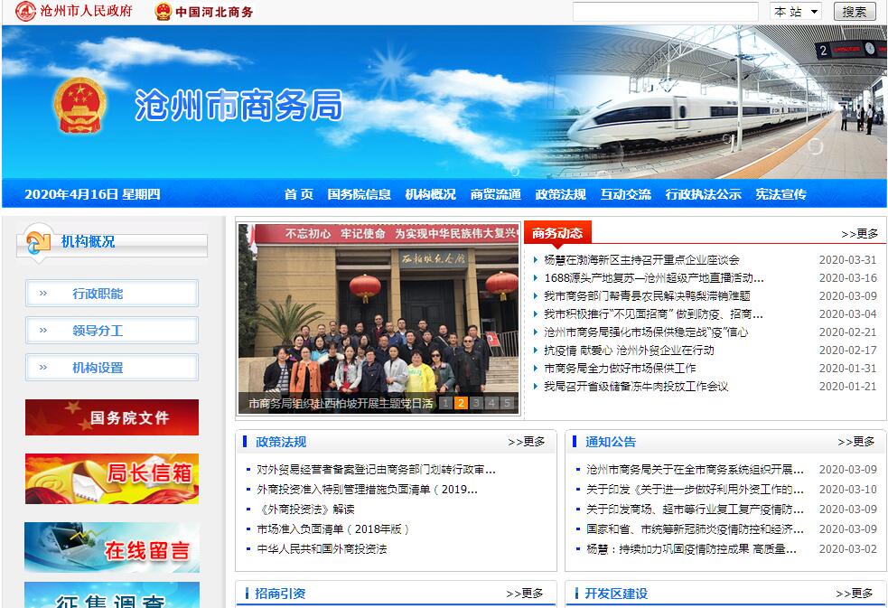 沧州市商务局主要职责:(一)贯彻落实国家和省有关内外贸易、国际经济合作和招商引资的发展战略、方针、政策以及相关法律法规;拟订全市相应的发展规划以及规定、办法和措施。(二)拟订全市国内贸易发展规划,提出引导国内外资金投向市场体系建设的政策建议,指导大宗产品批发市场规划和城市商业网点规划、商业体系建设工作,推进农村市场体系建设,组织实施农村现代流通网络工程。(三)组织实施国家和省财政性资金安排的有关领域重点投资项目,提出流通体制改革建议;负责推进流通产业结构调整,指导流通企业改革、商贸服务业和社区商业发展,提出促进商贸中小企业发展的政策建议;推动流通标准化和连锁经营、商业特许经营、物流配送、电子商务等现代物流方式的发展。(四)承担牵头协调整顿和规范市场经济秩序工作的责任。拟订全市规范市场运行、流通秩序的政策措施,推动商务领域信用建设,指导商业信用销售,建立市场诚信公共服务平台;按有关规定对特殊流通行业进行监督管理。(五)承担组织实施重要消费品市场调控和重要生产资料流通管理的责任。会同有关部门建立健全生活必需品市场供应应急管理机制,监测分析市场运行、商品供求状况,调查分析商品价格信息,进行预测预警和信息引导,按分工落实重要消费品储备管理和市场调控工作;按有关规定对酒类流通和成品油流通进行监督管理。(六)执行国家和省制定的进出口商品、加工贸易管理办法和进出口商品、技术目录;贯彻执行国家和省促进外贸增长方式转变、服务出口和服务外包发展的规划、政策和措施,拟订全市服务贸易发展规划并组织实施,指导贸易促进活动和外贸促进体系建设;贯彻执行国家和省对外技术贸易、进出口管制以及鼓励技术和成套设备进出口的贸易政策,依法监督技术引进、设备进口、国家限制出口的技术工作。(七)承担全市外商投资企业、招商引资和经济技术开发区(园区)管理责任。拟订全市外商投资管理办法并组织实施,负责全市外商投资企业设立及其变更事项的有关工作,依法监督检查外商投资企业执行有关法律法规规章、合同章程的情况并协调解决有关问题;拟定全市招商引资规划及推进措施并负责指导实施,负责谋划、组织、协调全市重大招商引资、投资促进活动,负责全市利用外资工作;贯彻国家和省、市对经济技术开发区(园区)的相关政策法规,负责园区规划发展有关政策、措施的研究和拟定;指导协调外商投诉处理工作。(八)负责全市对外经济合作工作;执行对外经济合作政策,依法监督管理对外投资、对外承包工程、对外劳务合作等活动;负责对外劳务合作企业经营资格核准和监督检查工作;执行中国公民出境就业管理政策,负责牵头外派劳务和境外就业人员的权益保护工作;拟订我市对外投资管理办法和具体措施。(九)负责全市商务系统涉及世贸组织相关事务的研究、指导和服务工作,推进我市进出口贸易的标准化建设;负责组织协调反倾销、反补贴、保障措施及其它与进出口公平贸易相关工作,建立进出口公平贸易预警机制;配合商务部、商务厅解决世贸组织框架下涉及我市的贸易争端,依法实施对外贸易调查和产业损害调查。(十)贯彻执行国家制定的对香港、澳门特别行政区和台湾地区的经贸规划、政策;管理国际组织或外国政府对我市经济技术合作方面的无偿援助及赠款等发展合作业务。(十一)依法对经营者集中行为进行反垄断审查,指导企业在国外的反垄断应诉工作。(十二)负责全市商务工作新闻发布、宣传工作并提供信息咨询服务,指导全市流通领域信息网络建设;指导监督以沧州市名义在境内举办的各种外经贸交易会、展览会、展销会等活动,拟订并实施赴境外举办上述活动的管理办法。(十三)承办市政府交办的其他事项。