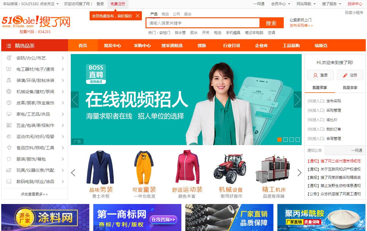 搜了网(51sole.com)专注于为企业用户提供B2B市场行情,热点采购、加工批发,产品信息,黄金商铺,网上推广等,是企业进行电子商务和网上推广的首选行业门户,聪明的老板上搜了网!深圳市搜了网络科技股份有限公司前身为深圳市搜了信息技术有限公司,成立于2008 年9月,并于2015年7月完成股份制改革,2015 年11月成功挂牌新三板。公司总部设立于深圳市南山区南海大道新能源大厦B座11楼,下设银川分公司。为国家高新技术企业。公司从搜索引擎起步,逐步成为国内领先的 B2B 电子商务平台运营商。公司主要产品为“搜了网”、“搜脉”APP 移动客户端、搜了旗下垂直电商平台。“搜了网”是搜了公司旗下核心平台,通过发布产品信息,促成客户沟通和达成交易,为中小企业提供免费信息服务、会员增值服务和网络推广服务等一站式电子商务运营服务。“搜脉”是“搜了网”向移动互联网端的延伸,更是将商业信息聚合开放,实现资源无缝对接,用户进行高效沟通,解放传统的聚集资源及人脉的模式,实现真正的生意人的移动网络平台。搜了旗下垂直电商平台集中了“搜了网”在运营中不断积累的优质资源,为有交易需求的企业用户提供对接渠道。公司通过独立域名或者搜了商城子域名为商家提供电子商务整体解决方案,覆盖了安防、化工、环保、机械、农业、冶金等多个细分行业,是一个拥有全新的系统架构和服务方式的垂直多行业 细分电商平台。深圳市搜了网络科技股份有限公司在不断坚持产品优化和创新的同时,始终坚信人才是公司最宝贵的资源,十分关注员工的成长和进步。公司通过多样性和及时性的绩效激励制度,鼓励价值创造,嘉奖价值创造;并通过营造良好的组织氛围,建立凝聚力强的企业文化,引导大家为共同的价值观和组织目标而努力奋斗。今天,深圳市搜了网络科技股份有限公司将继续强化“搜索技术、即时商机技术”及加强为中小企业提供服务的功能为战略发展方向,紧紧围绕、聚焦客户需求,成就客户事业为主轴,进一步加强研发力量,不断的为顾客、合作伙伴、员工创造新价值。未来,深圳市搜了网络科技股份有限公司将全面发展,依托技术创新、构筑产品优势、树立品牌 意识,从而使网络整合营销更加高效、简单、快捷。积极争取将公司打造成为一流的互联网企业。