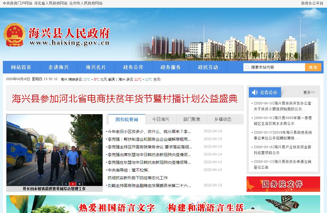 海兴县位于河北省东南部,东临渤海,南接齐鲁,北望京津,1965年建县,取“靠海而兴”之意而得名。现辖4镇、3乡、3个国营农场、1个省级经济技术开发区、197个行政村,人口23万,总面积960平方公里。1988年被国务院批准为沿海开放县。1994年被列为国家级贫困县,2002年被重新确定为国家扶贫开发工作重点县,2017年贫困退出工作顺利通过国家评估验收,在全省率先高标准实现脱贫出列目标。区位优势独特。距北京240公里,距天津120公里,处于“环渤海经济圈”和“京津冀都市圈”的中心位置,与被誉为“亚欧大陆桥新桥头堡”的黄骅综合大港“零距离”,海岸线30公里。产业发展强劲。体育器材、鱼子渔粉、渔网加工等传统产业不断提档升级。盐化工、装备制造、临港物流、新能源等新兴产业迅速崛起。投资1200亿元的海兴核电项目是河北省单体投资最大的项目,总投资15亿元的风电项目已于2008年并网发电,年发电量1.2亿千瓦时;总投资近80亿元的光伏发电应用领跑基地项目即将开工建设。核电、风电、光伏发电全部建成后,海兴将成为河北最大的“新能源基地”。文化淳朴厚重。海兴秉承燕赵、齐鲁文化传统,兼容慷慨、侠义品格,世世代代人才辈出。汉“天下卧虎令”巴肃、北魏大将军刁宣、唐父子宰相“笔头公”韩休、大画家韩滉及明吏部尚书杨巍、清兵部尚书孙葆元等名人灿若群星。海兴文化是冀鲁文化血脉交融的结晶,西路梆子(河北梆子的前身)、南锣等分别被列为国家、省非物质文化遗产。自然景色宜人。小山是沧州境内唯一一座山,形成于2--3万年第四纪晚期火山喷发,山上古树、古井、古墓、古地道星罗棋布,被省政府列为省级火山遗迹自然保护区。海兴湿地是河北沿海地区最大的湿地,湿地内芦苇如屏,舟荡鱼跃,水鸟低旋,丹顶鹤、白天鹅等300余种鸟类栖息于此,被中国动物学会列为“中国鸻鹬之乡”。境内遗存商周制盐遗址和五道古贝堤,生有柏、稔、枣、杜、桑等千百年国家一级古树300余株。长风破浪会有时,直挂云帆济沧海!当前,全县上下坚持以习近平新时代中国特色社会主义思想为统领,全面贯彻党的十九大精神,唱响“解放思想、实干兴县”主旋律,弘扬“四种文化”,实施“七大工程”,强力推进“一城一区四基地”建设,奋力开创新时代建设沿海强县、美丽海兴新局面。