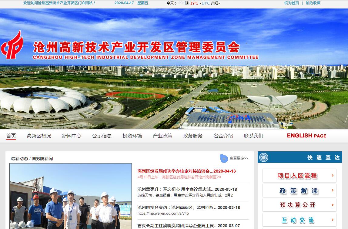 运河古郡,渤海明珠。一尊千年铁狮,见证了沧州历史的变迁;一条古老运河,孕育了沧州深厚的文脉;历经华丽蜕变,新时代的沧州,满怀豪情地奏响了建设创新驱动经济强市、生态宜居美丽沧州的新乐章!沧州高新区位于沧州市中心城区西部,北依京津,东临渤海,毗邻雄安新区,京沪高铁沧州西站设在区内,乘高铁到北京仅需51分钟,到上海仅需4个多小时,乘车到建设中的首都第二机场只需1个小时,纵横交错的立体交通网络,使这里成为了一片投资的宝地、创业的热土。这里,有明晰的产业发展定位。沧州高新区以高端装备双创平台为依托,规划建设了人工智能装备产业园;以华为云计算大数据中心、苏州纳米所为依托,规划建设了信息技术产业园。编制了两大产业的发展规划,分别设立了产业发展引导基金,出台了两大产业优惠扶持政策,全力打造智能装备、信息技术两大特色产业集群。新材料、节能环保、现代服务业也在这里快速聚集和发展。在这片投资兴业的热土上,聚集了中国航天太阳能光热、沧州明珠新材料、加拿大科光半导体等700余家高新技术企业,是河北省政府命名的节能环保示范区和军民融合产业示范区。这里,有完备的创新创业平台。沧州高新区建设了河北工业大学科技园、中国国际机器人产业园、北京航空航天大学科技园、华为云计算大数据中心、京津现代服务业产业转移基地“五大创新创业平台”。引进了中关村天合科技成果转化促进中心、清华启迪之星孵化基地、中科院苏州纳米所等科研单位和科技孵化机构。设立了院士专家服务中心、博士后科研工作站、科技大市场,组建了以国家“千人计划”专家为首的科技服务团队,拥有国家级小微企业创业辅导示范基地、省级院士工作站、省级科技孵化器,被省政府确定为区域性“双创”示范基地,成为沧州创新驱动的引领区和拉动区域产业转型升级的新引擎。这里,有一流的营商环境。沧州高新区基础设施完备,生活配套设施齐全,生态宜居。以湿地公园、狮城公园、森林公园和小流津河景观为纽带,构建了清新怡人的绿色生态体系。沧州高新区有一支干事敬业、担当务实的干部队伍, “追着企业搞服务,帮着客商去赚钱”,是高新区人最朴实的服务理念,只要客商定了干,一切手续我们办,实行一枚公章对外、一站式审批、一条龙服务,让项目投资人来的舒心,住的安心,干的顺心,赢的开心。站在新的历史起点上,沧州高新区将以十九大精神为指引,贯彻新发展理念,抢抓机遇,改革创新,以打造宜居宜业宜商的现代科技生态园区为目标,诚邀国内外客商前来考察交流洽谈。沧州高新区人郑重承诺:招商、敬商、安商、富商是我们的神圣职责;诚信、创新、合作、共赢是我们的永恒信条。聚集正能量,放飞新梦想。沧州高新区将携手各界英贤,同创宏图伟业,共赢美好未来!