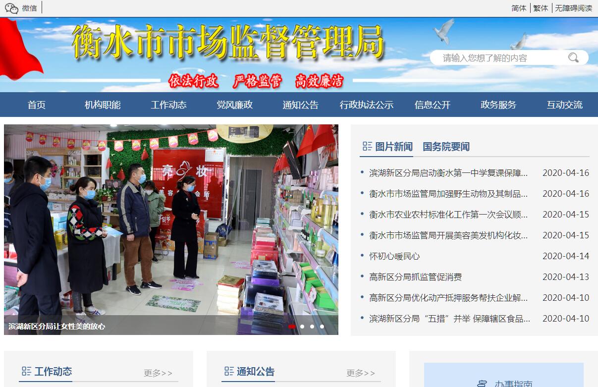 衡水市市场监督管理局主要职责:(一)负责全市市场综合监督管理。贯彻执行国家和省市场监督管理的方针、政策和有关法律法规,组织起草全市市场监督管理有关政府规范性文件,制定有关政策、标准,组织实施质量强市战略、食品安全战略、药品安全战略、标准化战略、知识产权战略,拟订并组织实施有关规划,规范和维护市场秩序,营造诚实守信、公平竞争的市场环境。(二)负责市场主体信用建设以及外商投资企业、外国(地区)企业常驻机构等市场主体的登记注册工作,建立市场主体信息公示和共享机制,依法公示和共享有关信息,加强信用监管,推动市场主体信用体系建设。(三)负责全市市场监管综合执法工作。负责全市市场监管综合执法队伍建设工作,推动实行统一的市场监管。组织查处重大违法案件。规范市场监管行政执法行为。(四)负责监督管理市场秩序。依法监督管理全市市场交易、网络商品交易及有关服务的行为。组织指导查处价格收费违法违规、不正当竞争、违法直销、传销、侵犯商标专利知识产权和制售假冒伪劣行为。组织推进竞争政策实施,组织实施公平竞争审查制度。依法对经营者集中行为进行反垄断审查,负责垄断协议、滥用市场支配地位和滥用行政权力排除、限制竞争等反垄断执法工作。指导企业在国外的反垄断应诉工作。指导全市广告业发展,监督管理广告活动。依法组织查处无照生产经营和相关无证生产经营行为。指导市消费者协会开展消费维权工作。(五)负责全市宏观质量管理。拟订并实施全市质量发展的制度措施。统筹全市质量基础设施建设与应用,会同有关部门组织实施重大工程设备质量监理制度,组织重大质量事故调查,组织实施缺陷产品召回制度,监督管理产品防伪工作。(六)负责全市产品质量安全监督管理。承担市级产品质量安全风险监控、监督抽查工作。组织实施质量分级制度、质量安全追溯制度、工业产品生产许可管理制度。负责纤维质量监督工作。(七)负责全市特种设备安全监督管理。综合管理特种设备安全监察、监督工作,监督检查高耗能特种设备节能标准和锅炉环境保护标准的执行情况。(八)负责食品安全监督管理综合协调。贯彻实施全市食品安全重大政策,推动健全食品安全地方党政同责和跨部门协调联动机制。负责食品安全应急体系建设,组织指导全市重大食品安全事件应急处置和调查处理工作。建立健全食品安全信息统一公布和重要信息直报制度。承担衡水市政府食品安全委员会日常工作。(九)负责食品安全监督管理。建立覆盖食品生产、流通、消费全过程的监督检查制度和隐患排查治理机制并组织实施,防范区域性、系统性食品安全风险。推动建立食品生产经营者落实主体责任的机制,健全食品安全追溯体系。参与食品安全风险监测,组织开展食品安全监督抽检、核查处置和风险预警、风险交流工作。按职责分工组织实施特殊食品监督管理。组织指导重大活动食品安全保障。(十)负责药品(含中药、民族药,下同)、医疗器械和化妆品安全监督管理。贯彻执行国家、省药品、医疗器械和化妆品法律法规以及鼓励药品、医疗器械和化妆品新技术新产品的管理与服务政策。拟订全市监督管理政策并组织实施。组织落实分类管理制度,配合实施国家基本药物制度。建立健全全市药品不良反应、医疗器械不良事件、化妆品不良反应和药物滥用监测体系,并组织开展监测、评价和处置工作,依法承担安全应急管理工作。推动落实药品、医疗器械和化妆品安全企业主体责任,监督县(市、区)履行党政同责,组织实施药品、医疗器械和化妆品安全考核。(十一)负责药品、医疗器械和化妆品质量管理和监督检查。监督实施经营、使用质量管理规范,贯彻落实国家、省检查制度,依职责组织指导查处药品零售、医疗器械生产经营、化妆品经营和药品、医疗器械使用环节的违法行为。承接省药品监督管理局委托和下放的职责。(十二)推进全市药品、医疗器械和化妆品安全监管信息化建设。负责制定药品、医疗器械和化妆品的安全科技发展规划并组织实施,推动检验检测体系、电子监管追溯体系和信息化建设。完善全市药品、医疗器械和化妆品安全信息统一公布和重大信息直报制度,公布重大安全信息。(十三)负责统一管理全市计量工作。推行法定计量单位和国家计量制度,管理计量器具及量值传递和比对工作。规范、监督商品量和市场计量行为。(十四)负责统一管理全市标准化工作。负责制定市级地方标准,依法承担组织省级地方标准申报工作。承担市级地方标准的立项、编号、批准发布工作。宣传贯彻强制性、推荐性国家标准和行业标准、地方标准。依法协调指导和监督团体标准、企业标准制定工作。组织开展标准化国际、区域合作和参与制定、采用国际标准工作。(十五)负责统一管理全市检验检测工作。推进检验检测机构整合和改革,规范检验检测市场,完善检验检测体系,指导协调检验检测行业发展。(十六)负责统一管理、监督和协调全市认证认可工作。组织贯彻实施国家统一的认证认可和合格评定监督管理制度。(十七)负责推进全市知识产权管理工作。拟订加强知识产权强市建设的重大方针政策和发展规划。拟订强化知识产权创造、保护和运用的政策和制度,并组织实施